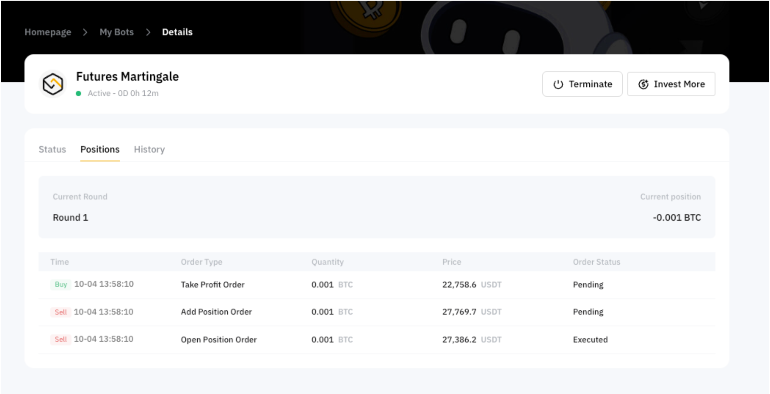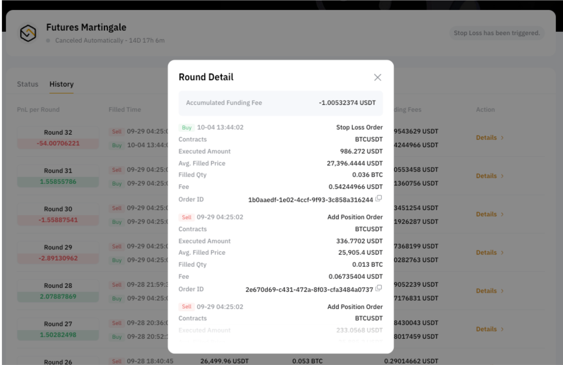 The bot history page shows realized PnL details for the previous rounds. Click on Details and you will see the order history and accumulated fees for each round.