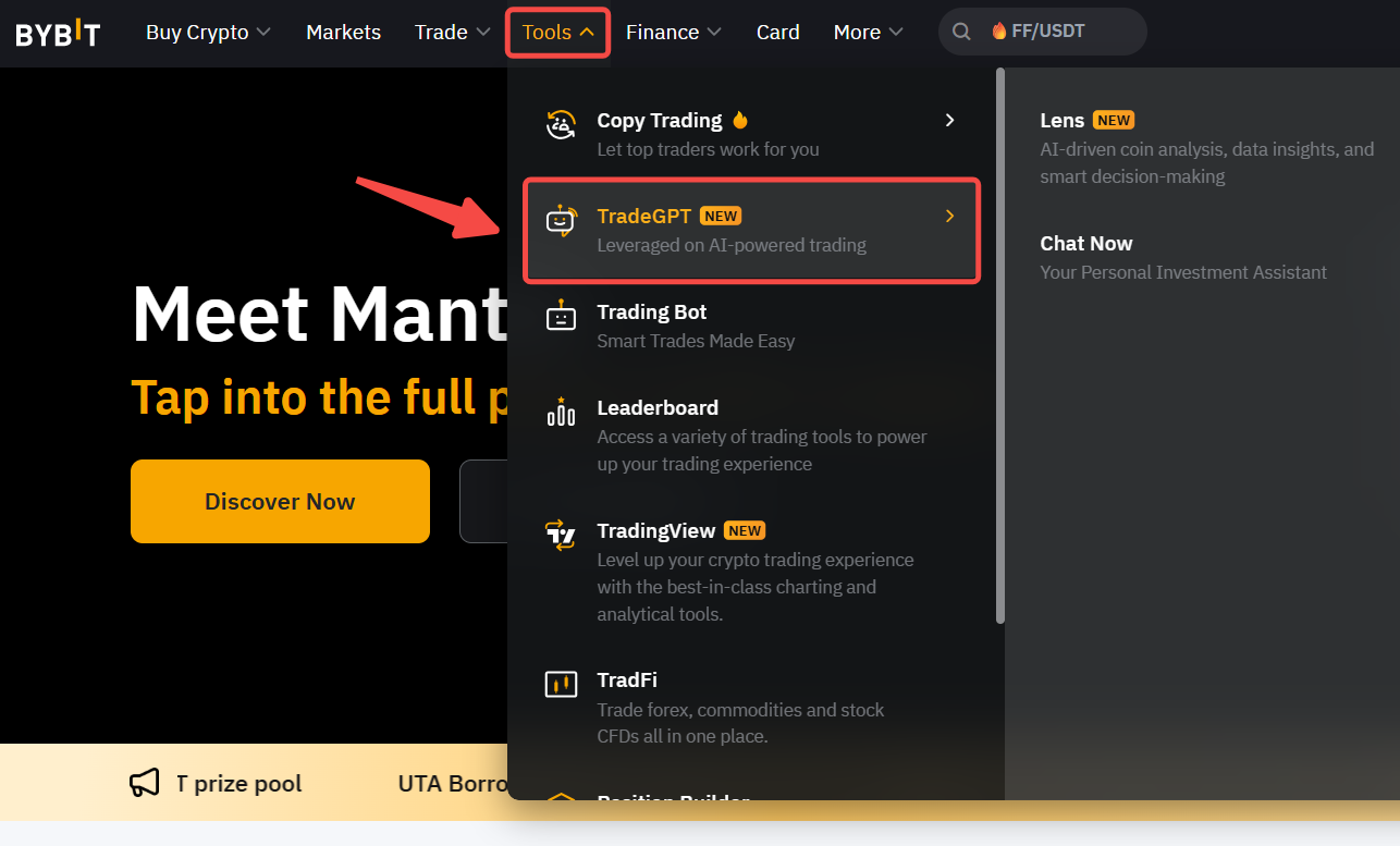 For Bybit website users, simply click on this link or navigate to Tools in the Bybit page's navigation bar and select TradeGPT.