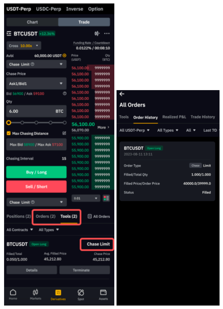 On the Bybit App, go to the Derivatives page, tap on the dropdown list of Order Types, and select Chase Limit Orders.