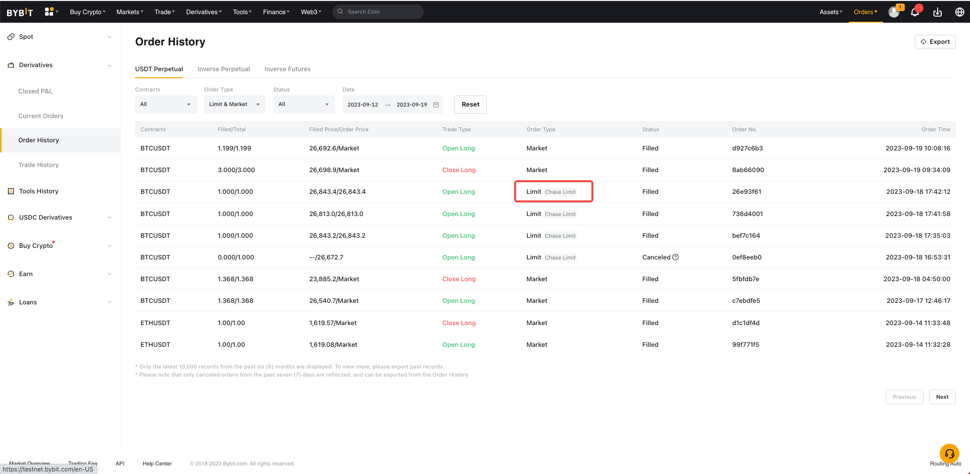 Currently, the Chase Limit Order is available for Inverse Contracts, USDT Perpetuals, USDC Perpetuals, and USDC Futures on Bybit.