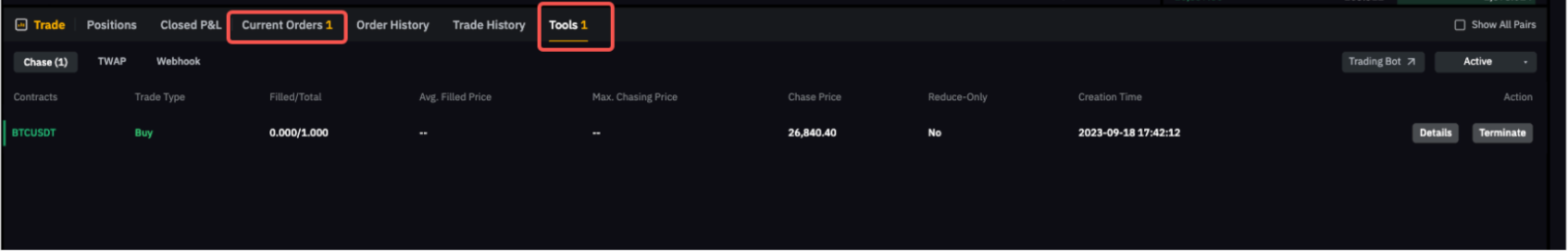 Select Orders or Tools tab to view your current Chase Limit Orders. To view the executed or canceled Chase Limit Orders, go to Order History, and you will see the Chase Limit Orders with a Chase label.