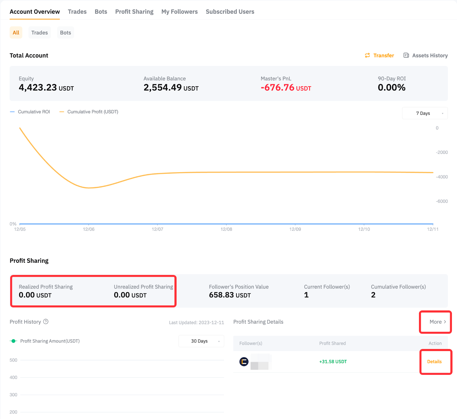 Profit Sharing Details: Click on Details beside your Followers and you will be able to see the profit sharing details from USDT Perpetual trades.