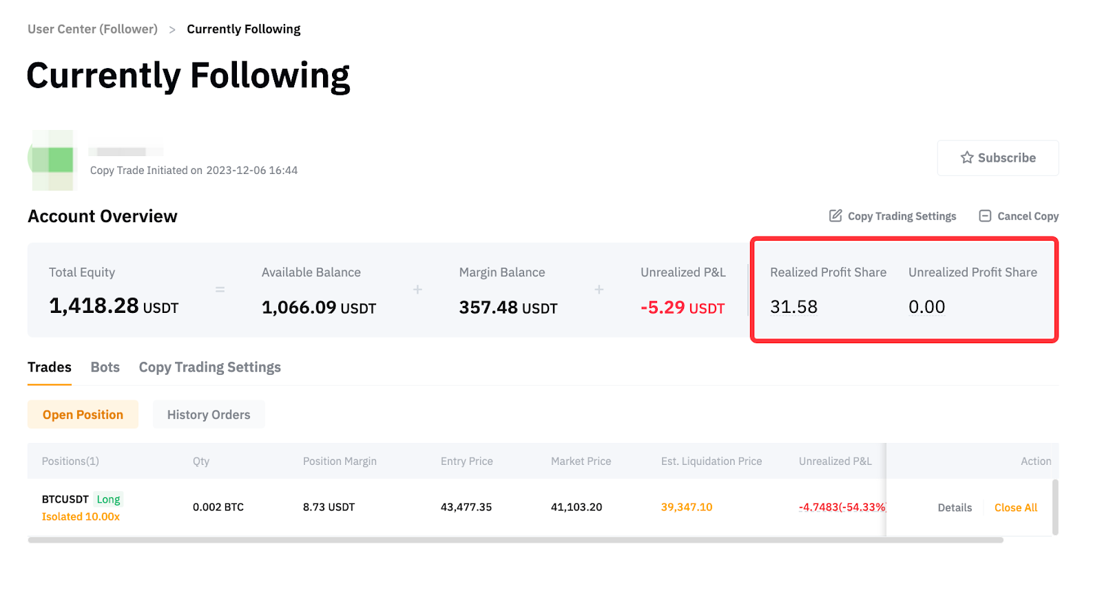 2. Unrealized Profit Share: This reflects the unrealized profit share yet to be settled. However, this amount does not represent your actual profit share to be settled on the upcoming settlement day. The unrealized profit-sharing figure is subject to change for various reasons, such as the need for refunds to followers in case the net P&L shows losses or if some trades opened on the same day remain unclosed.