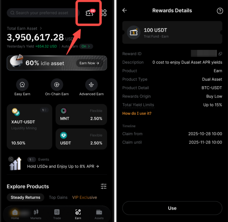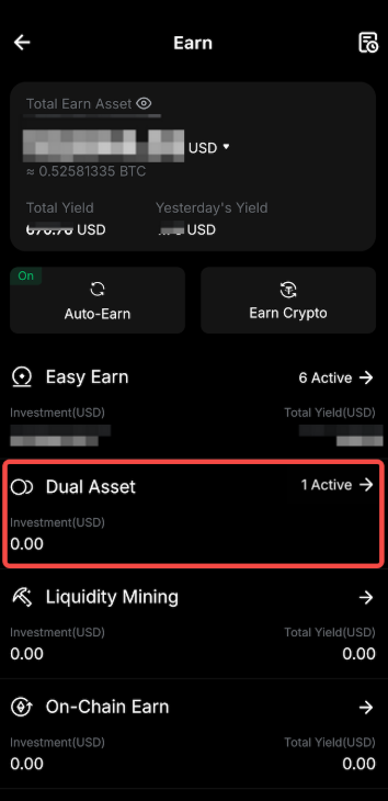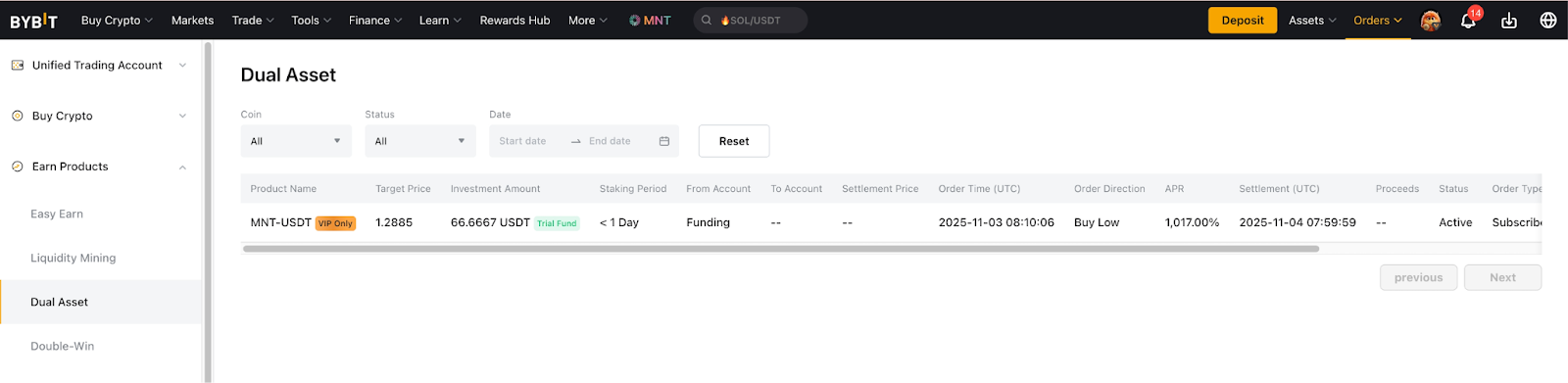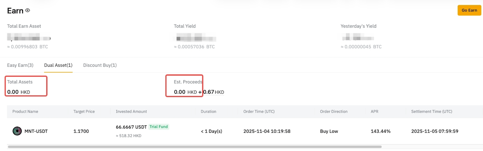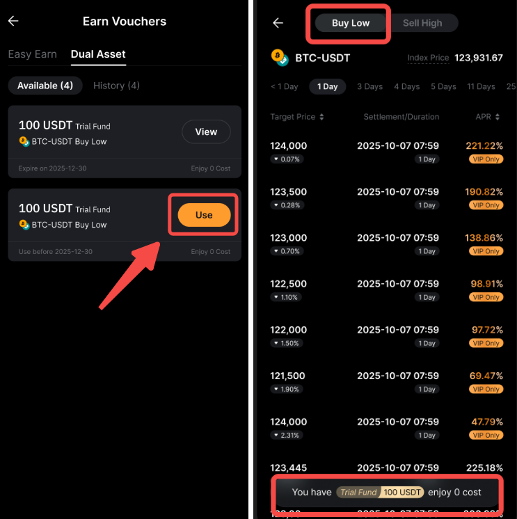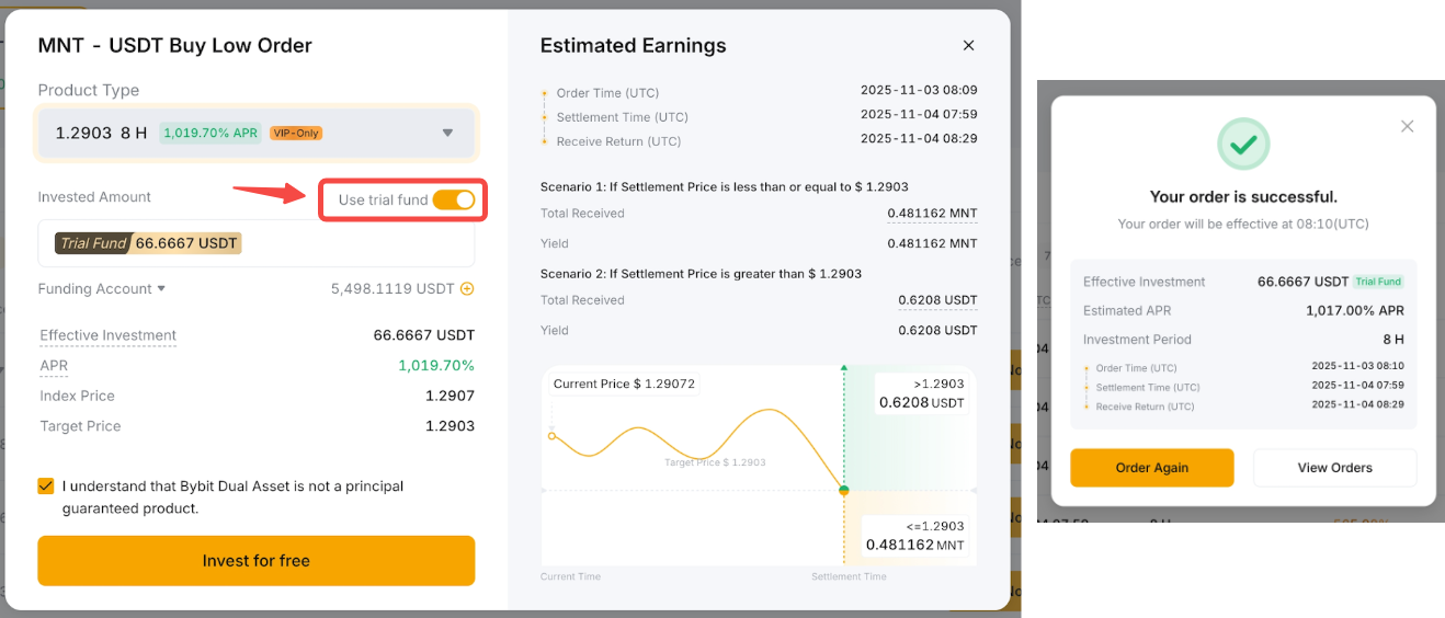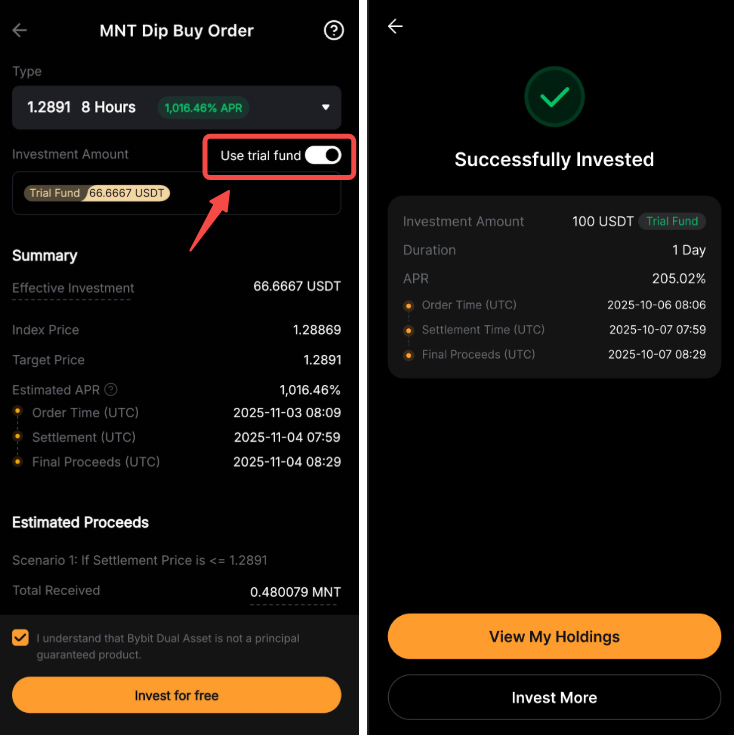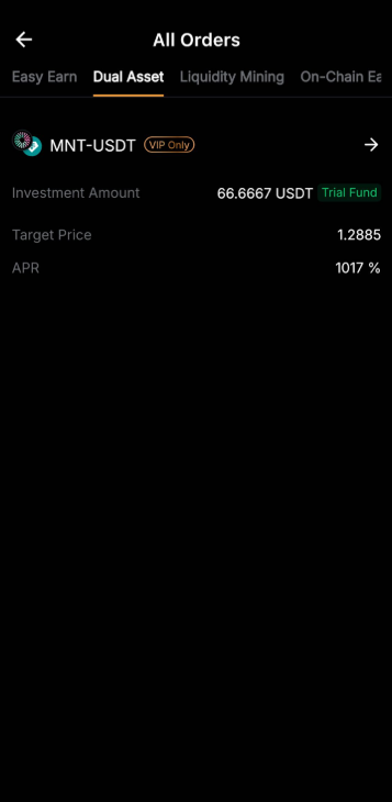 The Dual Asset trial fund allows you to experience actual Dual Asset returns without incurring any costs. Your earnings are determined by the product's settlement price and APR. While the yield will be added to your account, the trial fund principal will not be counted towards your total assets.