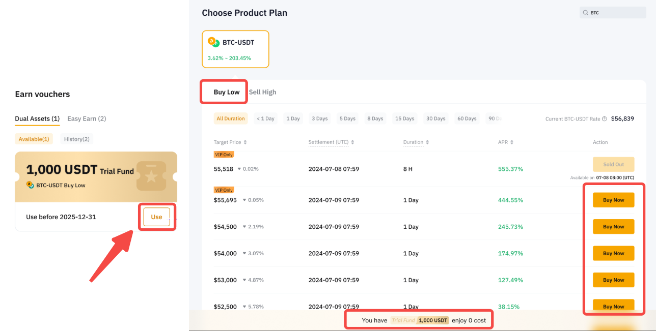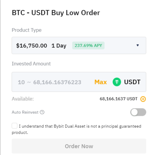 There are two types of products under Dual Asset 2.0: Buy Low and Sell High. You can choose from short-term deposit periods of 1, 3 and 5 days.