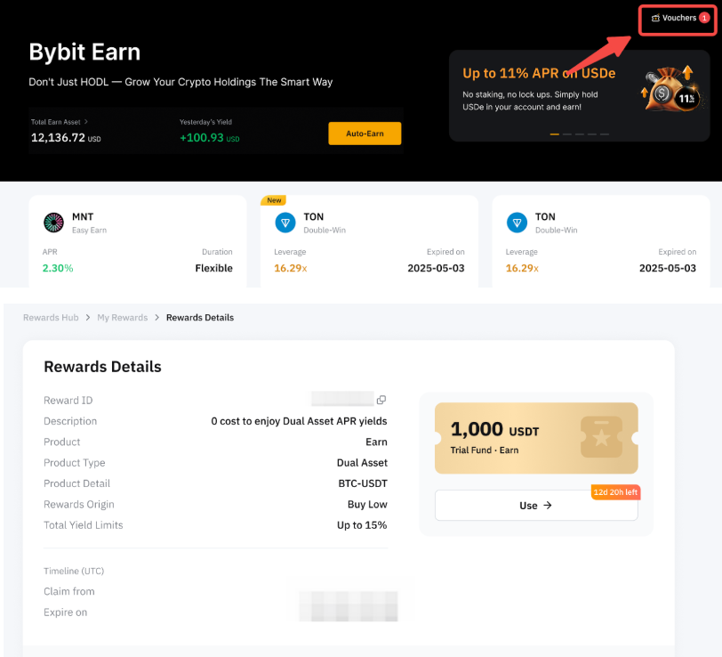 If you are eligible for a Trial Fund for the Dual Asset product, you will find the rewards on the Bybit Earn page under Voucher, located in the upper right corner. Alternatively, you may also find these Trial Fund rewards on the My Rewards page.
