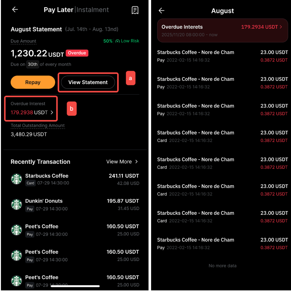 By tapping Installment on the Bybit Pay Later page → (a) View Statement or (b) Overdue Interest, you can see the overdue interest and each breakdown.