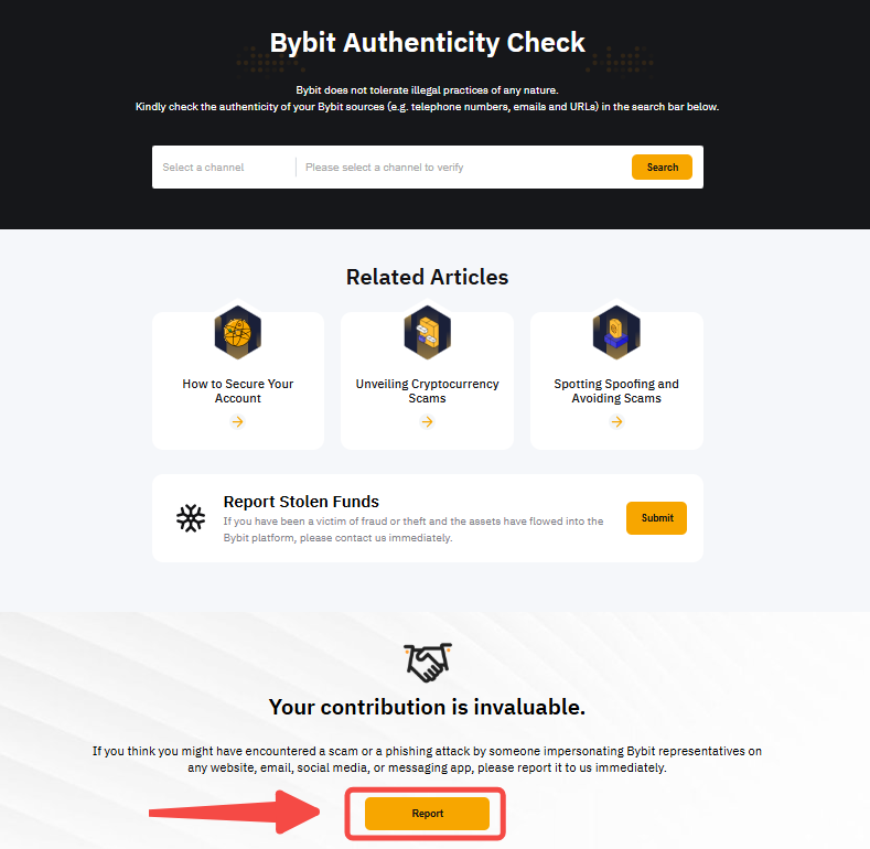 To ensure the legitimacy of any Bybit-related domains or sources of information (such as emails, phone numbers, URLs, or social media accounts), kindly utilize the Bybit Authenticity Check feature.