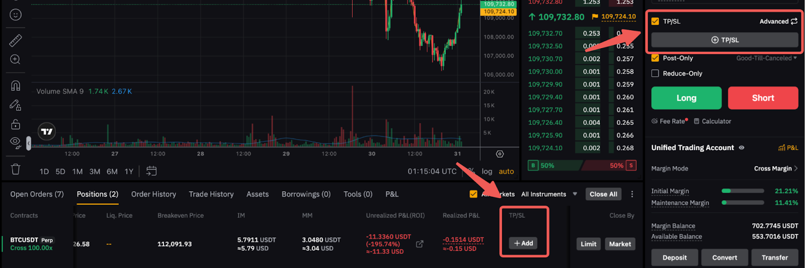 To set a TP/SL for your orders upon order creation, simply click on the Take Profit/Stop Loss on the order zone when you create your order. Alternatively, you can set a TP/SL for your open position from the position tab. For more details, please refer to this page.