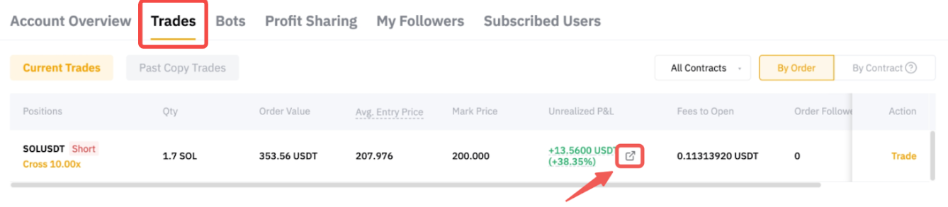 On the Trader's Center page, you can view order details either By Order or By Contract. Under the By Order tab, it shows the orders placed by each respective Master Trader. Under the By Contract tab, all orders for the same trading pairs opened in the same direction are consolidated into one position. The position Average Entry Price, Order Quantity, Mark Price, and Liquidation Price are displayed from a position perspective. It will be reset only when the respective direction of the position is fully closed.