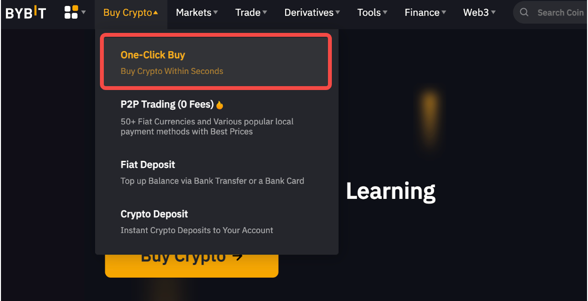 Step 1: Log in to your Bybit account and click on Buy Crypto on the navigation bar of the Bybit website, then select One-Click Buy.