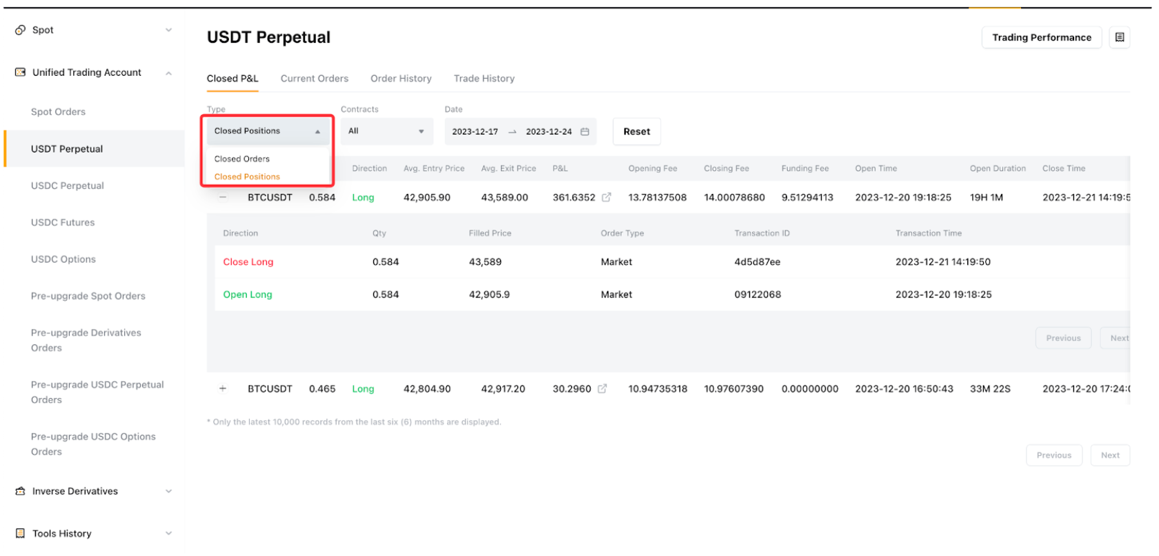 1) On Closed P&L history, it shows the final position P&L considering the fee charges after closing the position. You can see two types of Closed P&L: Closed Positions and Closed Orders.