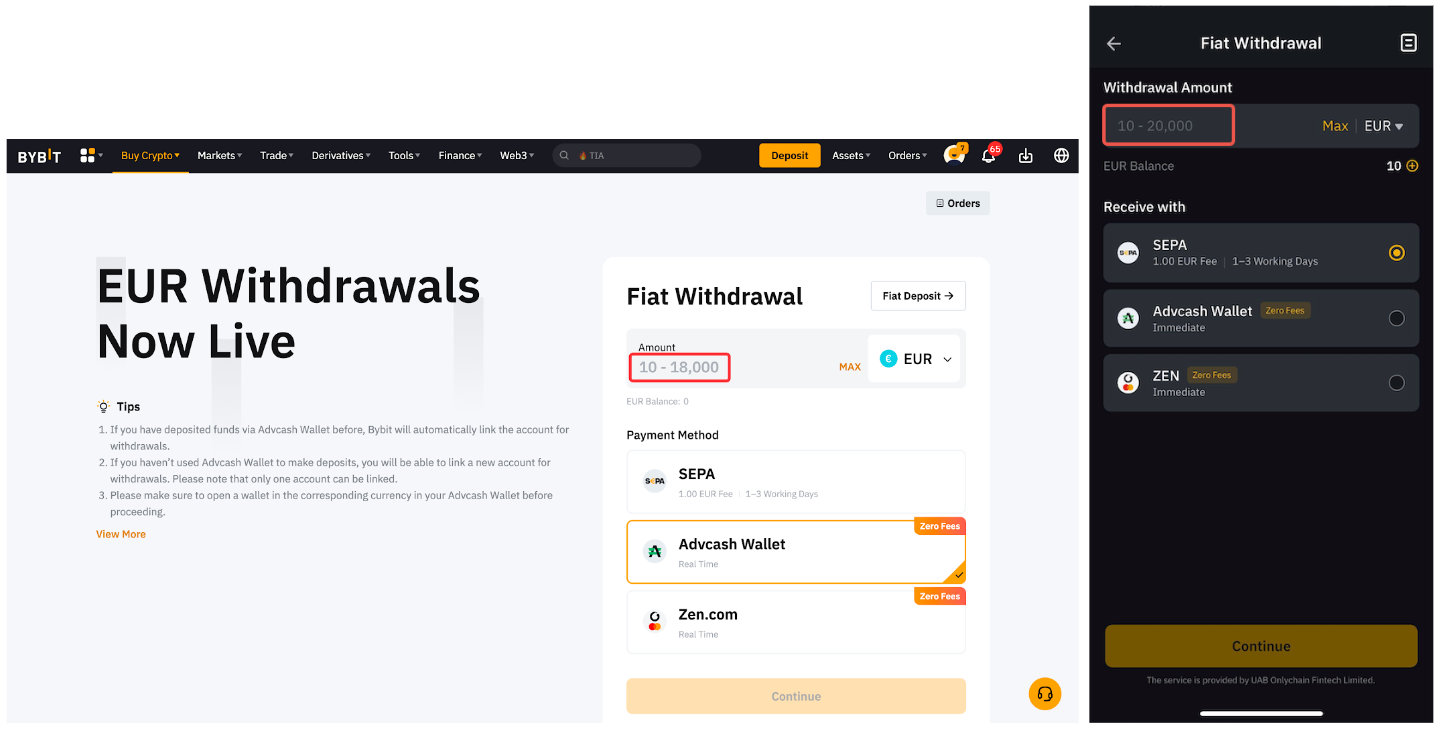 El tiempo de procesamiento puede variar en función de la moneda fiat y del método de pago seleccionado. Puede encontrar el tiempo de procesamiento estimado para cada divisa yendo a la página de retiro de fondos fiduciarios y seleccionando la divisa de su elección. Para más información, lea también los consejos que aparecen junto a la ventana de pedido.