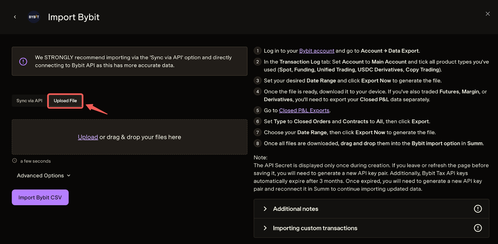 — Asegúrate de verificar los datos importados y de verificar que los detalles de la transacción coincidan con tus expectativas de Bybit. Summ te avisará si falta algún dato o si hay errores en el archivo.