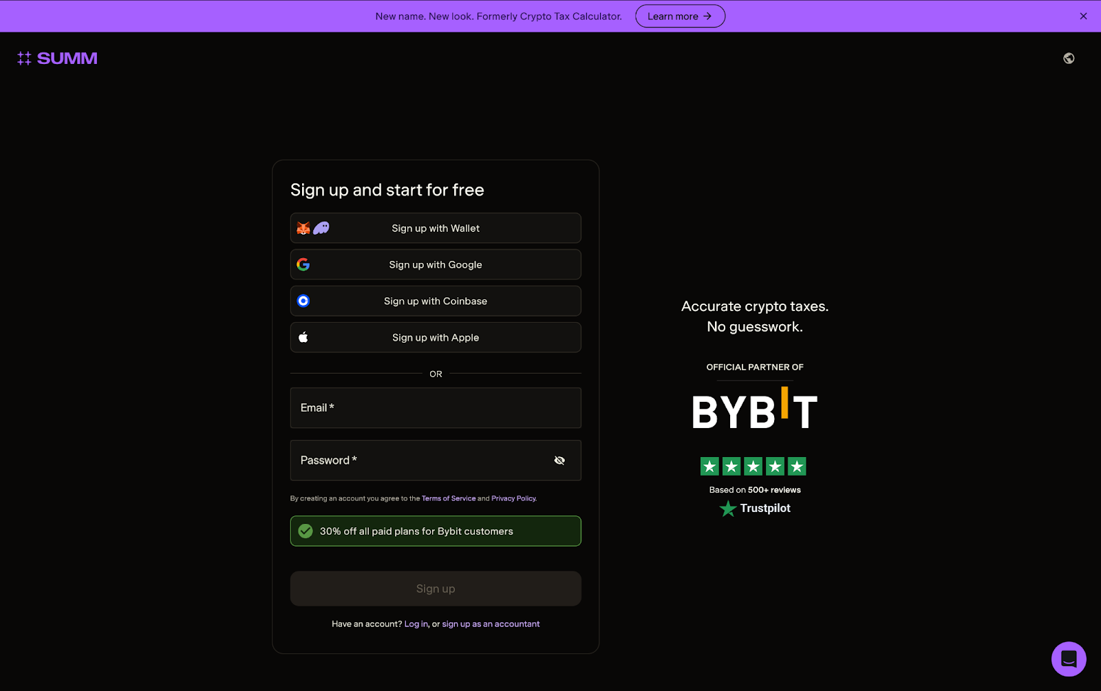 Para facilitarte la vida, Bybit se ha integrado en Summ (formerly Crypto Tax Calculator) para que no tengas que preocuparte por los cálculos manuales. Simplemente conecta tu cuenta y tus transacciones se importarán automáticamente, junto con una gama de informes de impuestos listos para que los envíes. Veamos cómo hacer tus impuestos de Bybit con Summ.