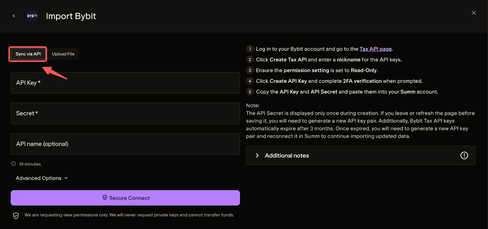 Una vez que hayas creado la clave API en Bybit, selecciona la opción Sincronizar mediante API en Summ e introduce la clave API y el secreto de API generados. Haz clic en Conexión segura una vez que hayas terminado.