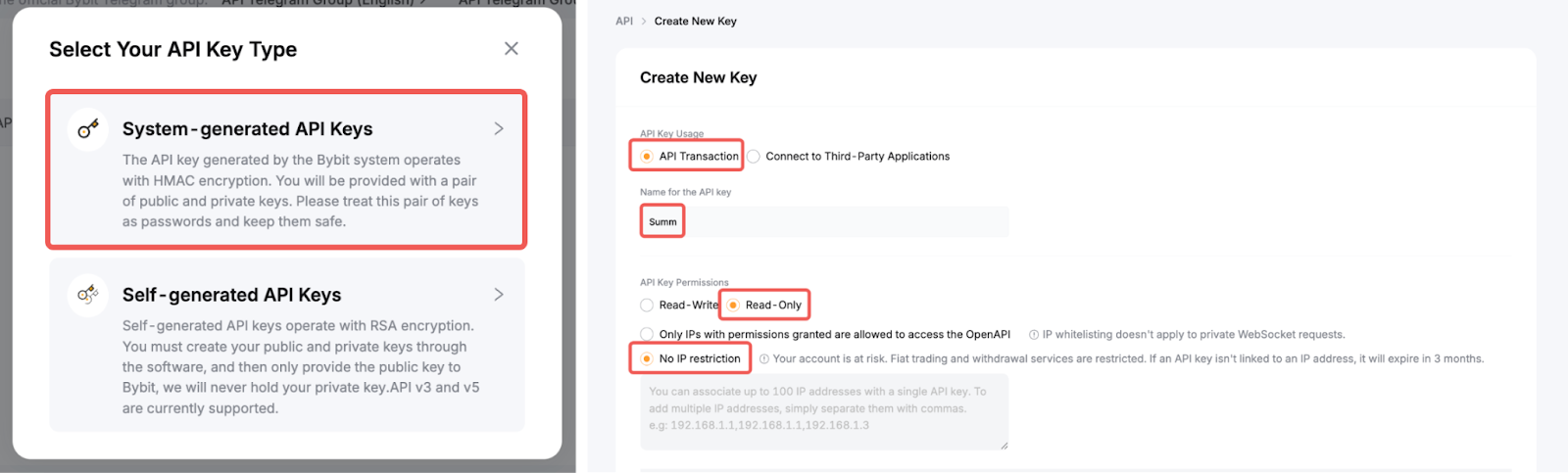 - Permisos de clave API: Solo lectura y sin restricciones de IP