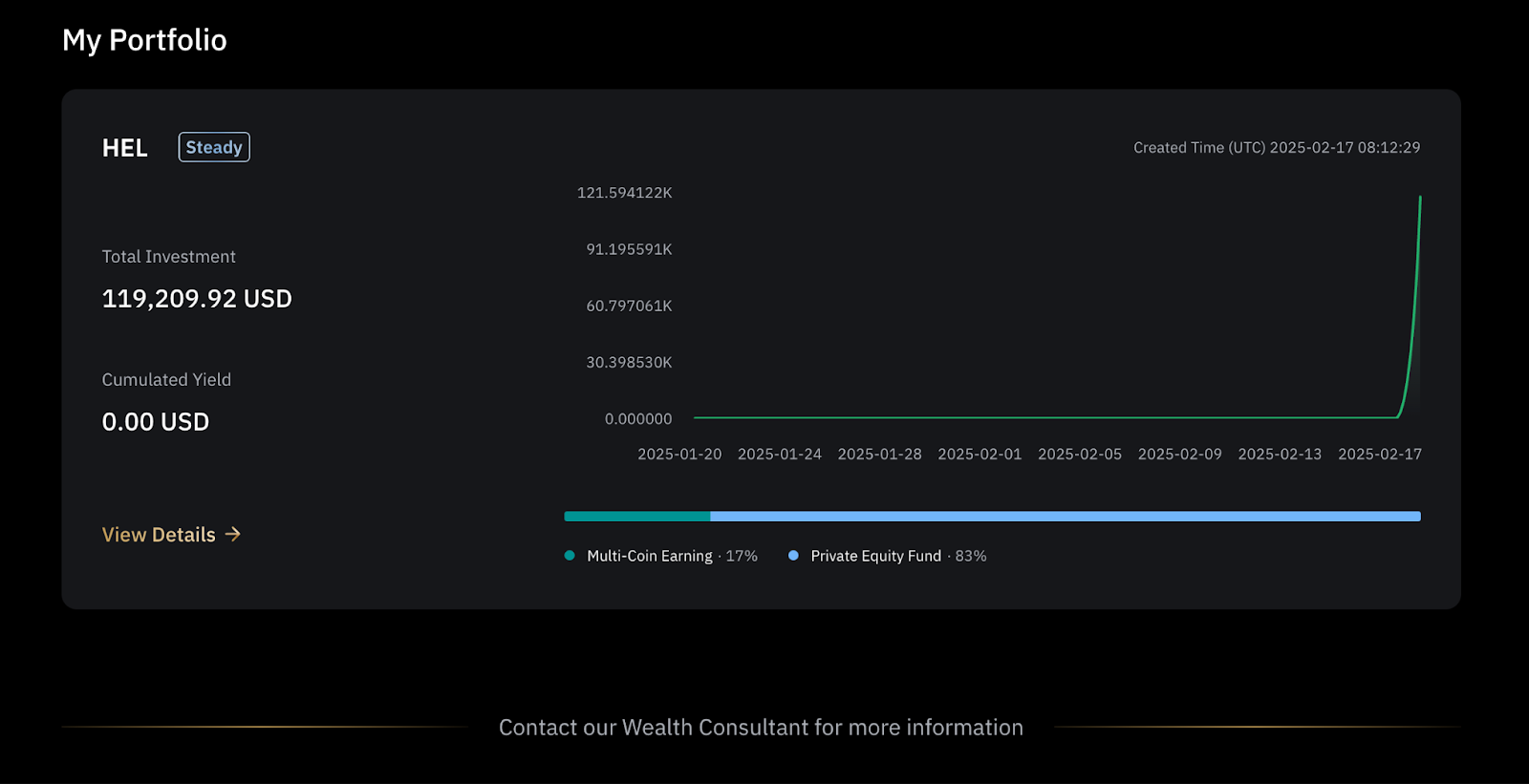 Nuestros expertos asignan criptoactivos de primera calidad y herramientas de inversión adaptadas a tu perfil de riesgo y expectativas de rentabilidad. Una vez confirmado, nuestro equipo de gestión de patrimonios privados completará tu plan de inversión y los detalles estarán accesibles en tu panel de control PWM.