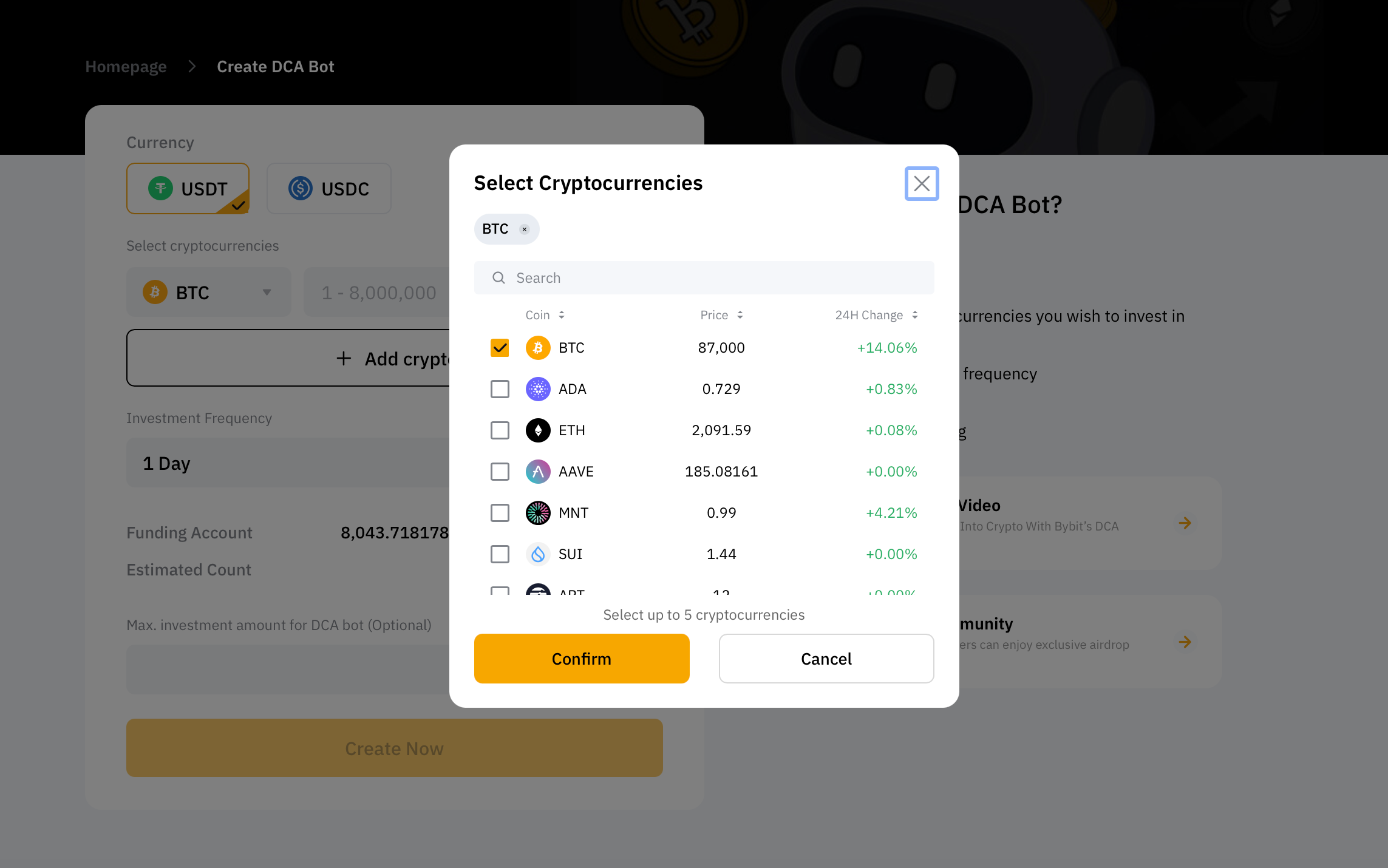 Puedes seleccionar hasta cinco monedas para un bot DCA.