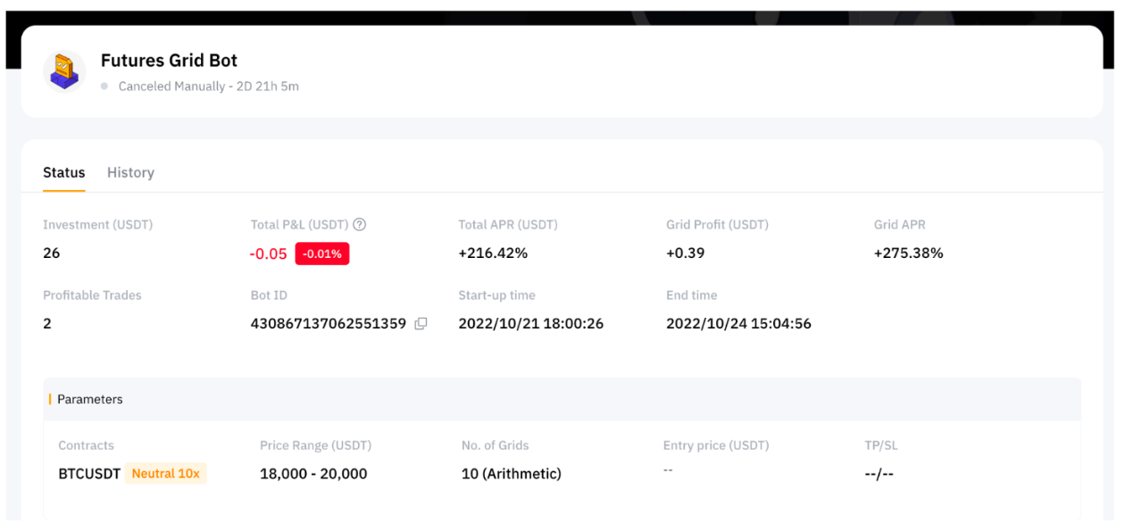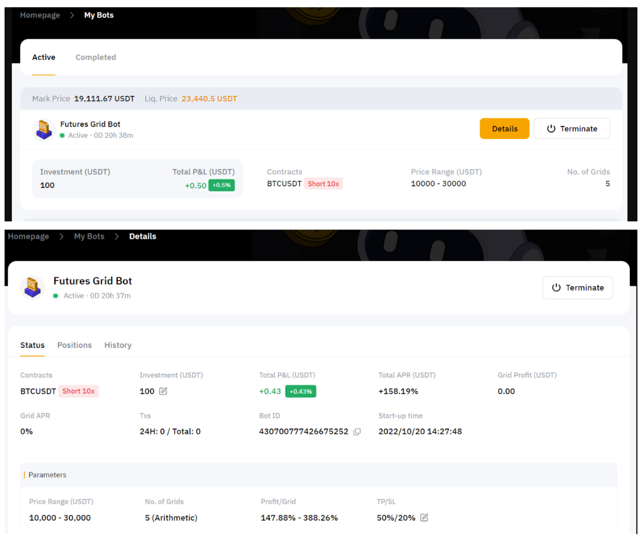 Las posiciones abiertas mantenidas por el Grid Bot de Futuros permanecerán abiertas si el precio de mercado cae fuera del rango de precios establecido y el Grid Bot no colocará ninguna orden nueva hasta que el precio vuelva al rango predefinido. Los usuarios tienen la opción de terminar los bots manualmente si así lo desean.