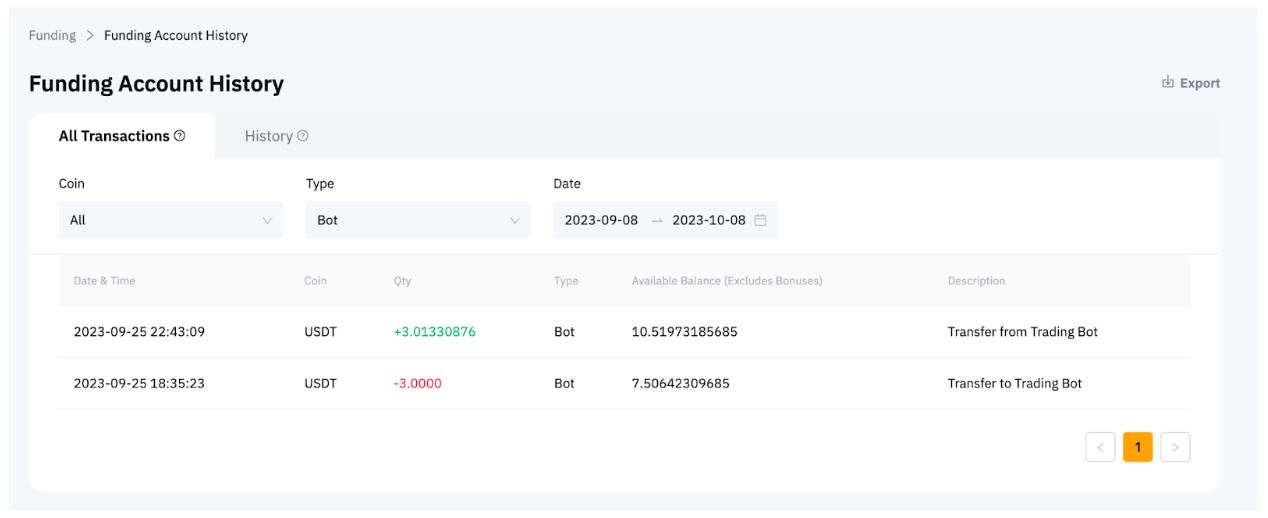 Haga clic en Activos → Cuenta de financiación → Historial → Seleccione Bot en la pestaña Tipo de la página Todas las transacciones.