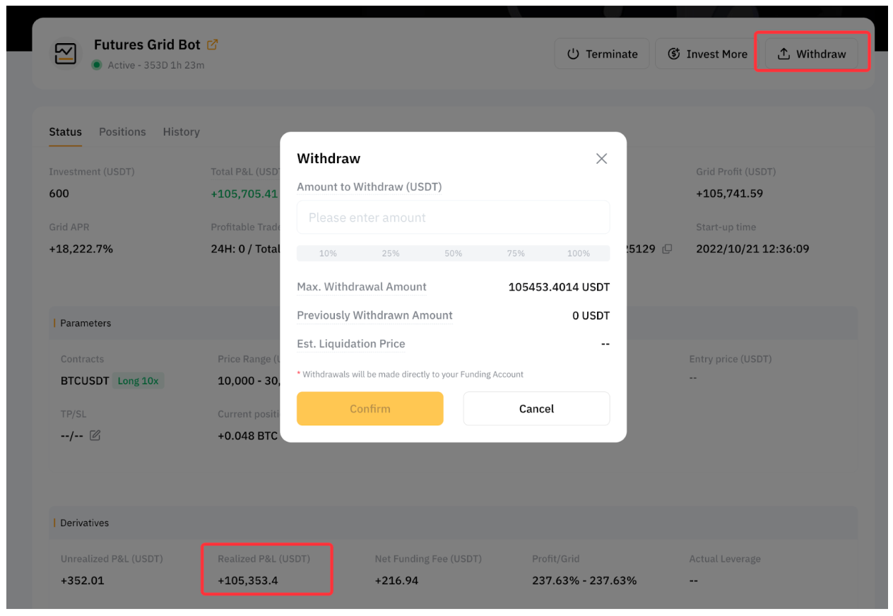 Todos los bots de trading se canalizarán directamente a través de la Cuenta de Financiación. Cuando cree un Futures Grid Bot, el sistema transferirá automáticamente el importe de la inversión desde su Cuenta de Financiación al Bot de Trading. Una vez finalizado el bot, el importe de la inversión y los beneficios (si los hubiera) se transferirán también a su cuenta de financiación.