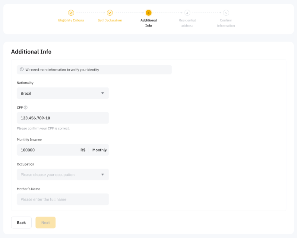 Paso 5: Proporciona información adicional sobre tu nacionalidad, CPF, ingresos mensuales, nombre de la madre y ocupación.