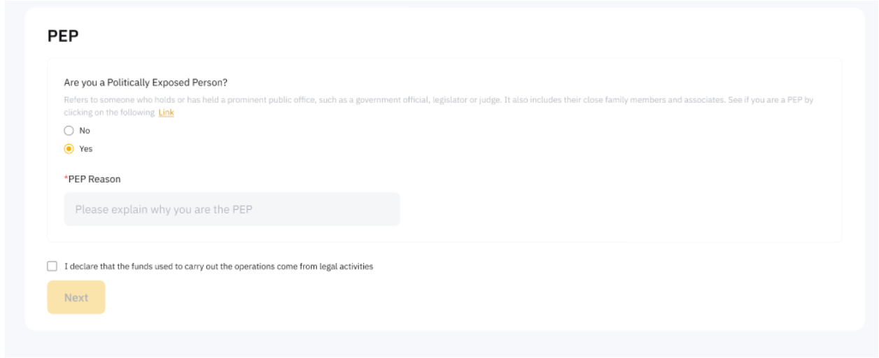 Paso 4: Completa la declaración PEP y reconoce que los fondos utilizados para llevar a cabo las operaciones provienen de actividades legales.