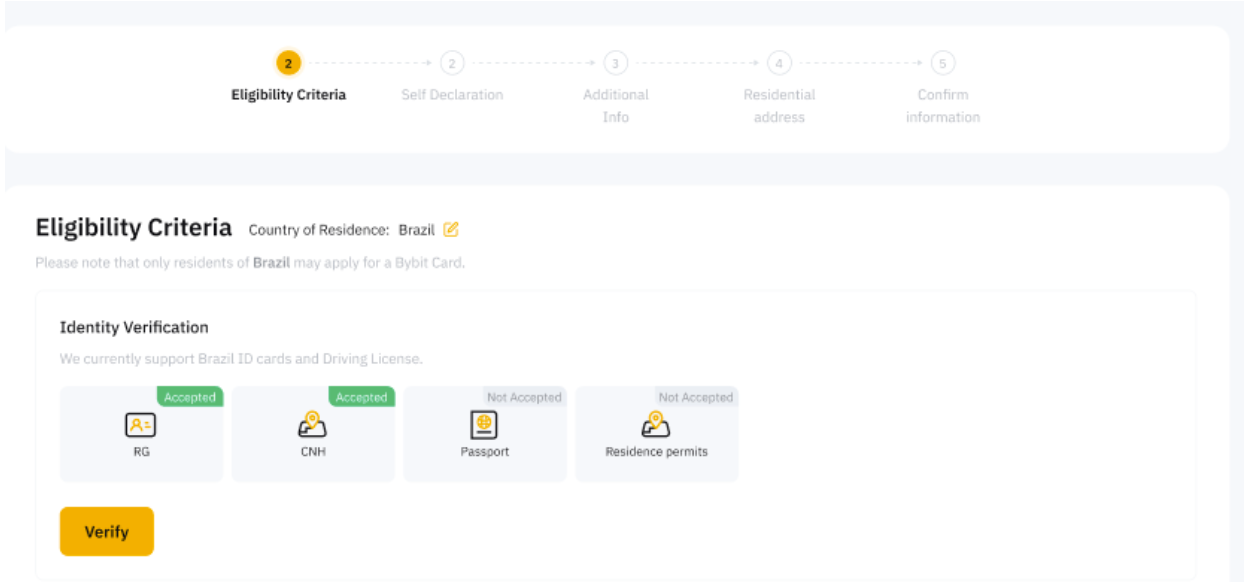 Nota: Bybit Card tiene requisitos más estrictos para la verificación de identidad. Por lo tanto, es posible que deba actualizar su verificación de identidad aunque ya la haya completado en su cuenta de Bybit anteriormente.