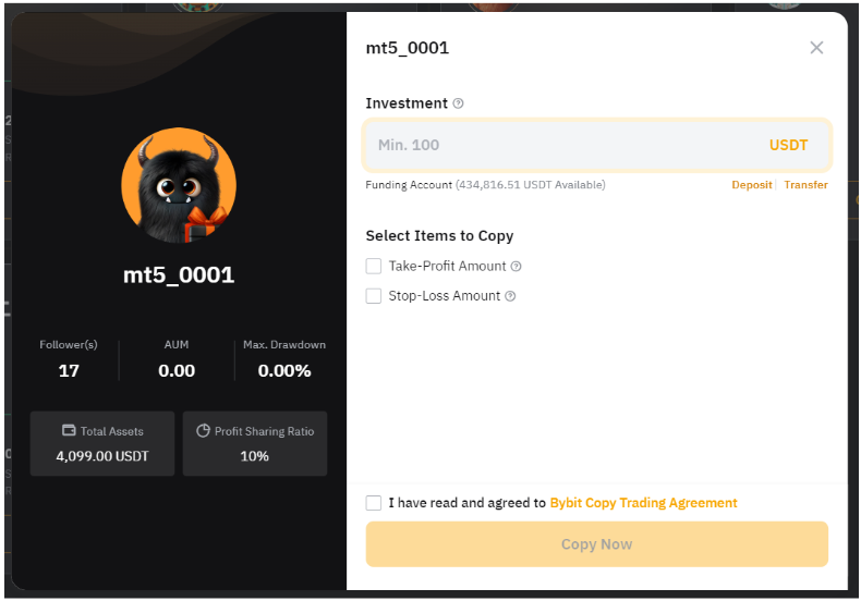 Inversión: los importes de inversión mínimo y máximo para seguidores son de 100 USDx y 1,000,000 USDx, respectivamente. Ten en cuenta que tu Master Trader puede establecer un importe mínimo de inversión más alto para la copia y podrás ver la cantidad indicada en la columna.