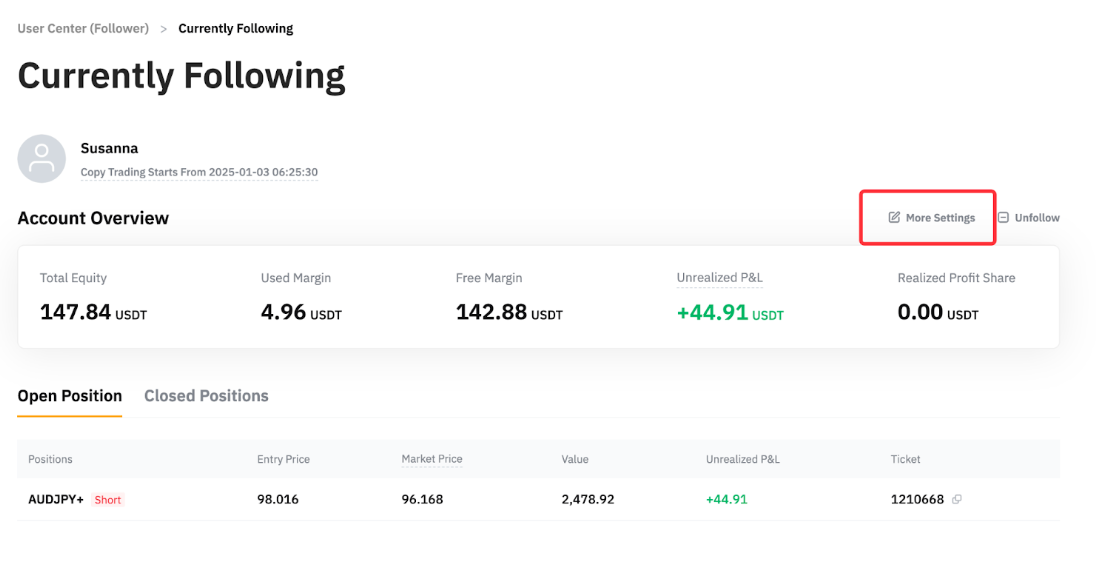 Puedes ajustar los parámetros de tu copy trade siguiendo los pasos que se indican a continuación.