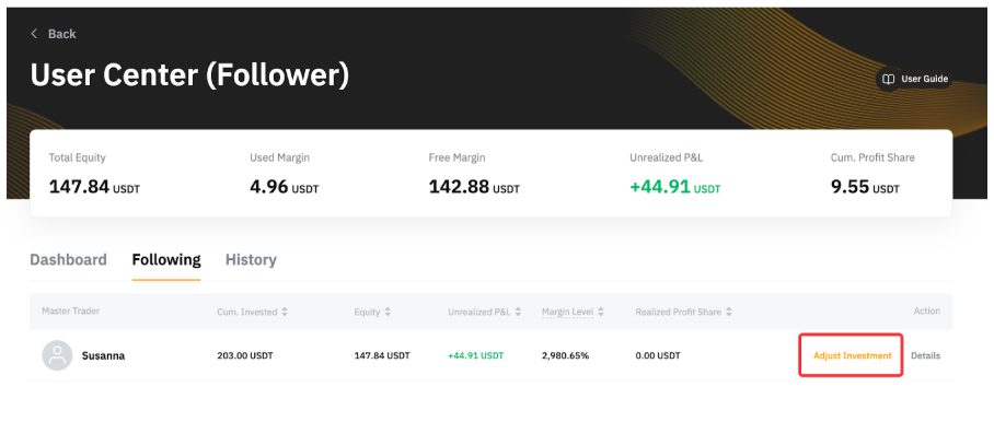 Paso 1: ve al Centro de usuario (seguidor) → Siguiendo → Ajustar inversión. Después, haz clic en Aumentar inversión o Reducir inversión. Una vez enviada, la solicitud para reducir la inversión no puede retirarse.