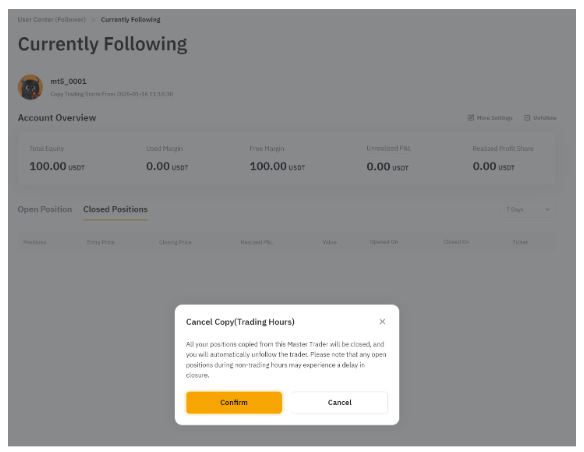 Se cerrarán todas las posiciones bajo el Master Trader respectivo y dejarás automáticamente de seguir al Master Trader cuando se active el TP/SL. Tenga en cuenta que los disparadores de Stop Loss (SL) no se ejecutan al instante y podrían experimentar un retraso de unos minutos debido a las condiciones del mercado, la prioridad de ejecución y el tiempo de procesamiento del sistema.