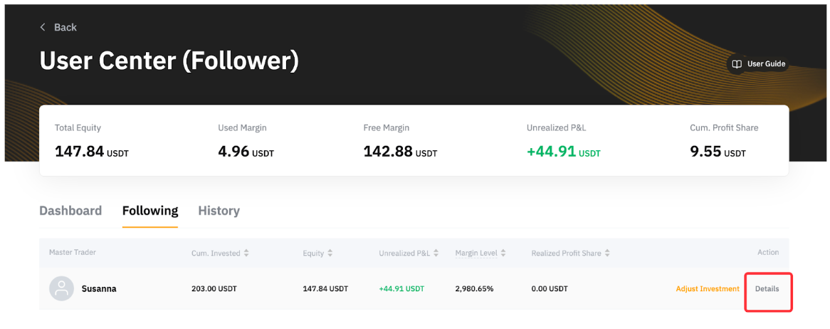 Para cancelar la copia a un Master Trader, ve al Centro de usuarios (seguidor) → Siguiendo y haz clic en Detalles del Master Trader en cuestión al que deseas dejar de seguir.