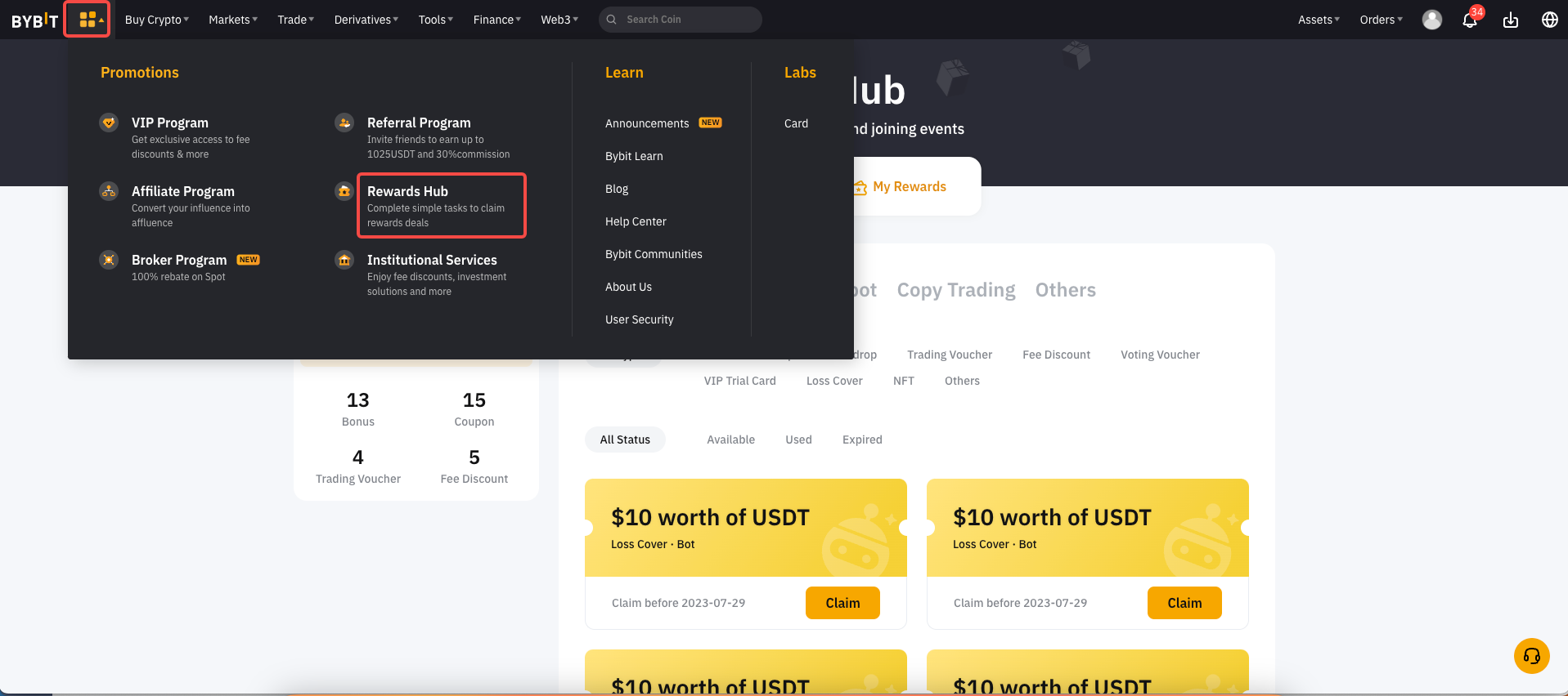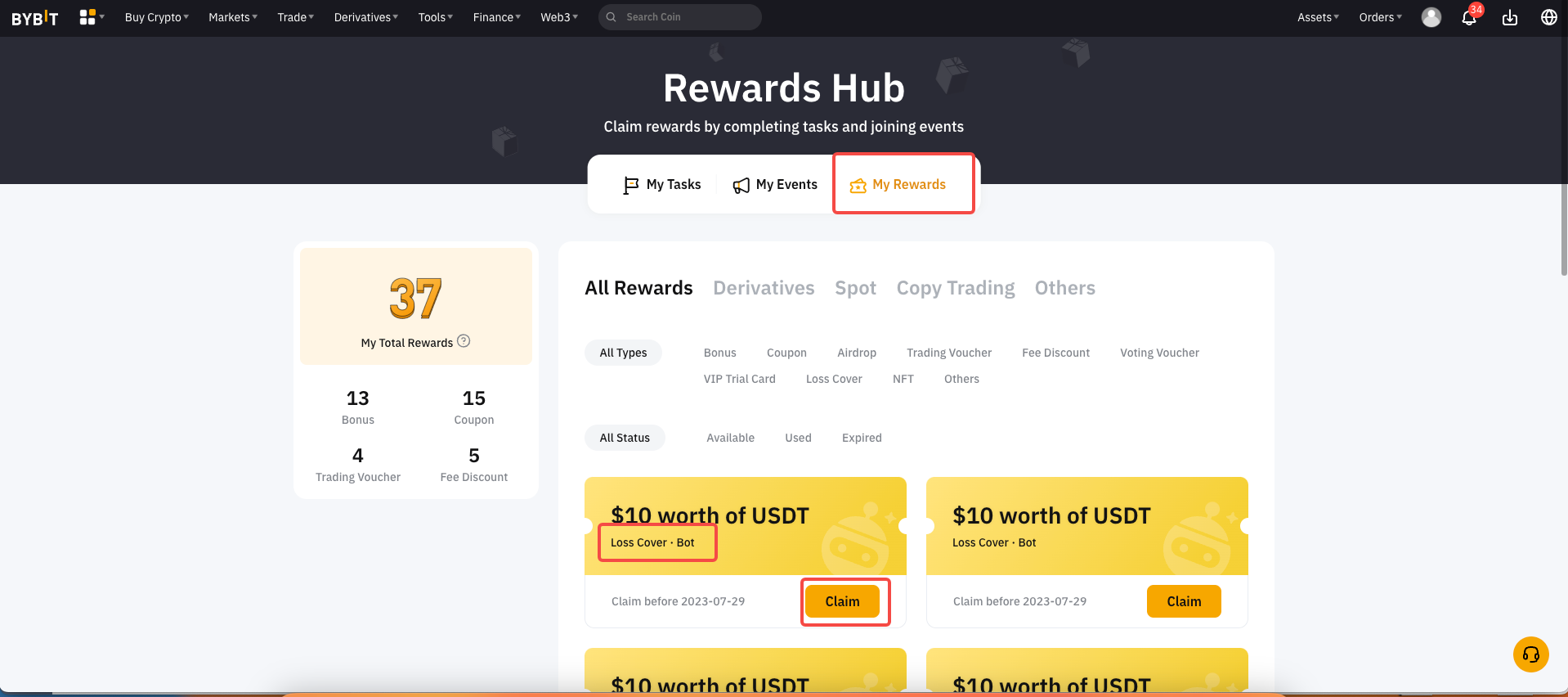 El voucher de cobertura de pérdidas es una recompensa diseñada para ayudar a compensar las posibles pérdidas incurridas durante el trading con bots. Los traders pueden solicitar este voucher en el Centro de recompensas y aplicarlo a varios trading bots, como el grid bot spot, el grid bot de futuros y el bot DCA.