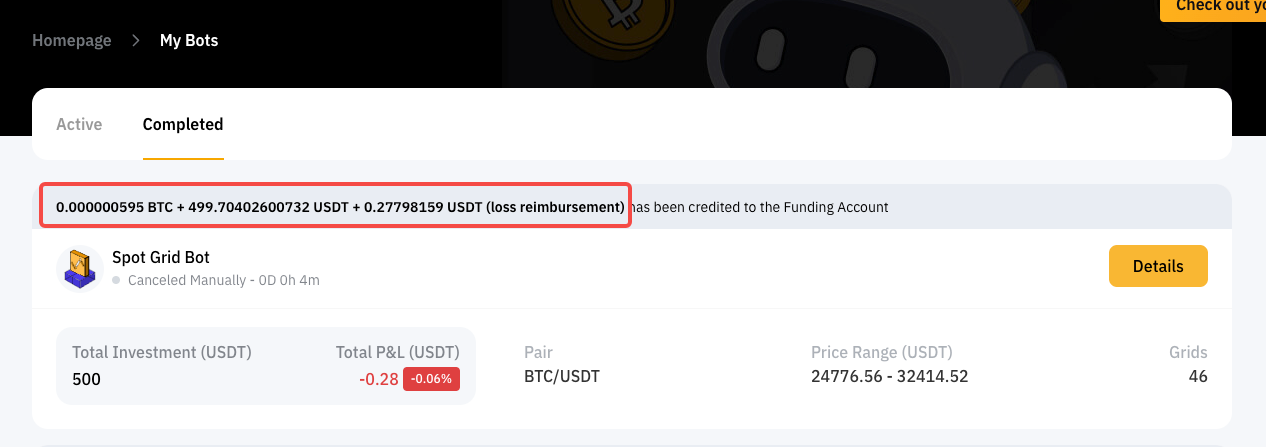 Puedes ver el importe del reembolso abonado en tu cuenta de fondos desde Mis bots → Completado.