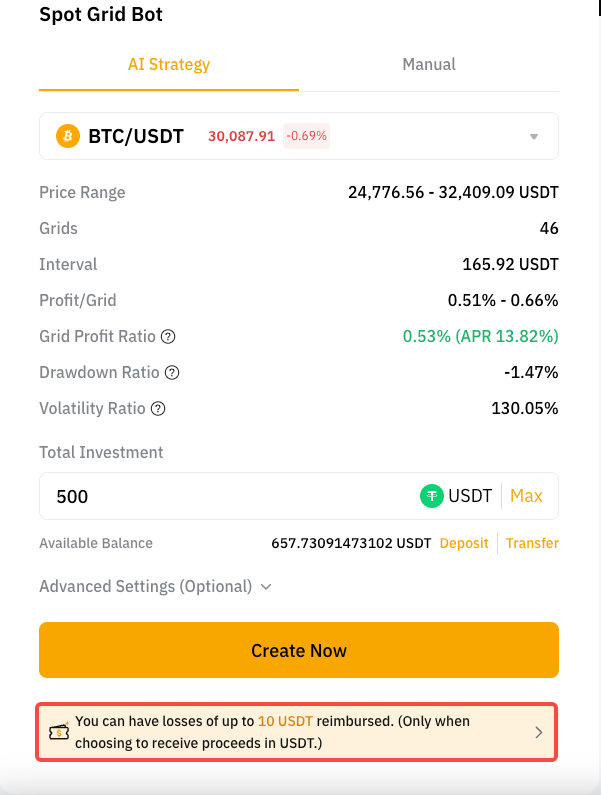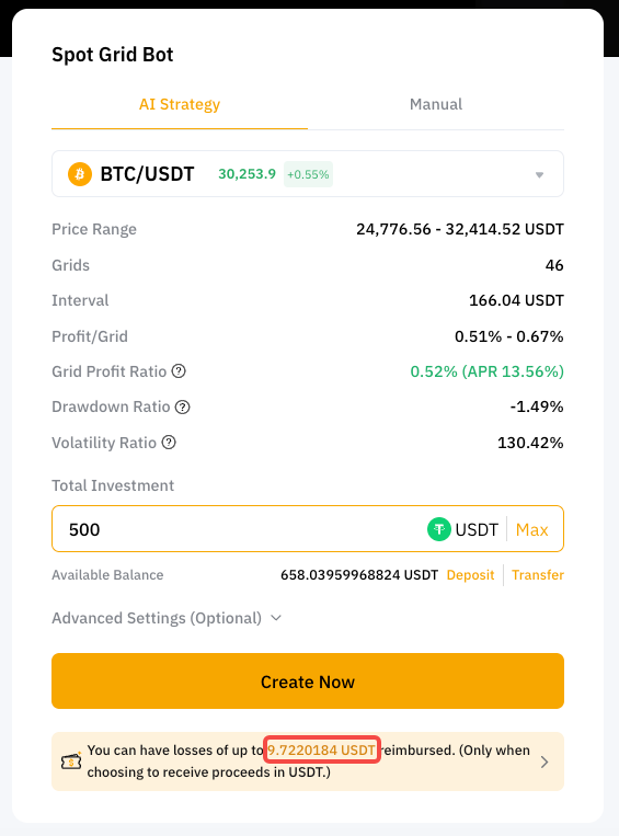 Durante el proceso de creación del bot, podrás ver el importe de tu voucher de cobertura de pérdidas. Ten en cuenta que el voucher solo tendrá efecto tras la finalización del bot. Por lo tanto, necesitarás tener fondos suficientes para operar con tu bot inicialmente.