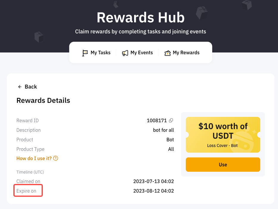 Una vez que hayas reclamado con éxito tu voucher, puedes hacer clic en Ver recompensas para consultar los detalles. Si deseas utilizarlo inmediatamente, haz clic en Usar. Se te redirigirá a la página de Trading bot, donde podrás crear un bot.