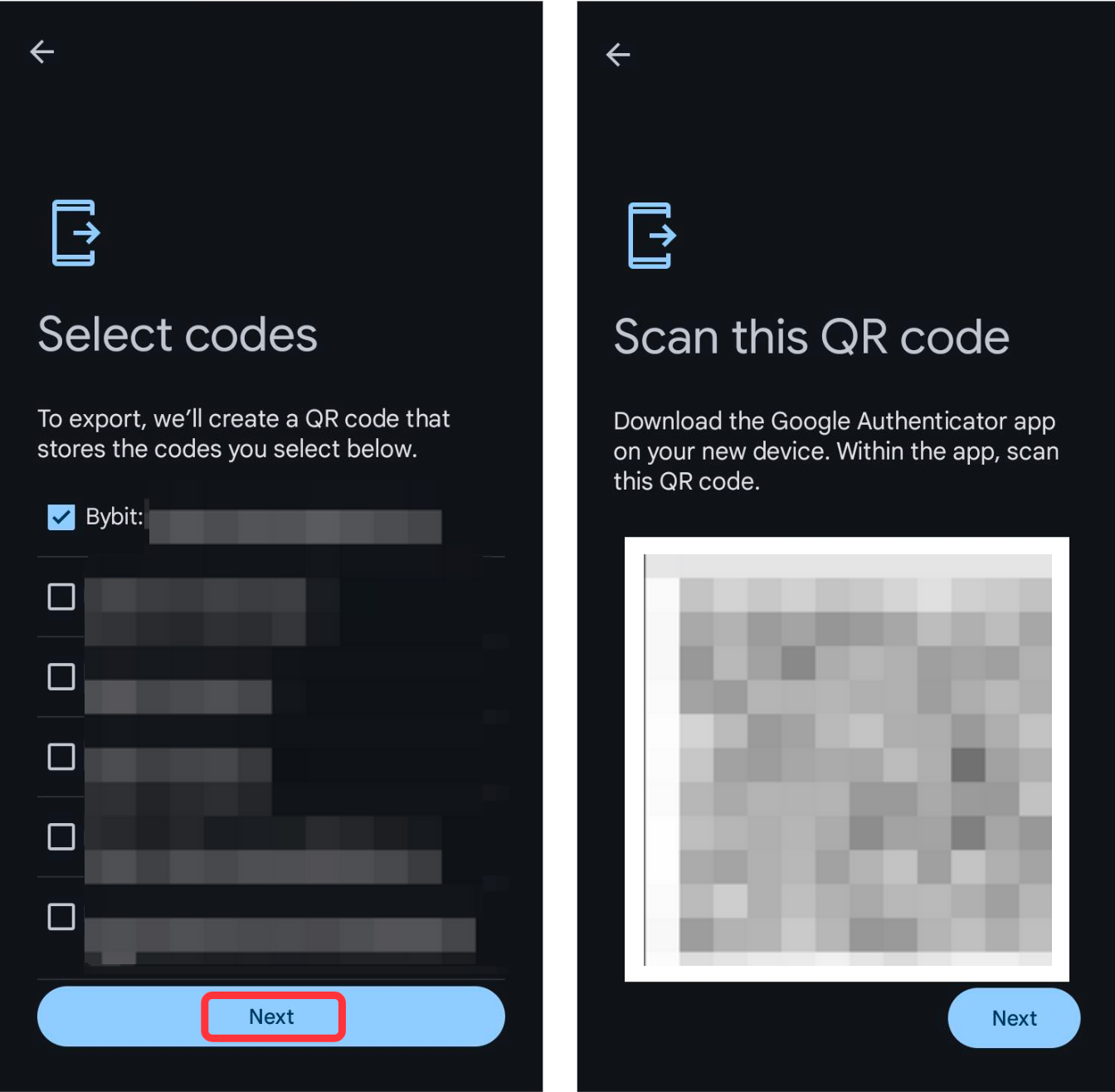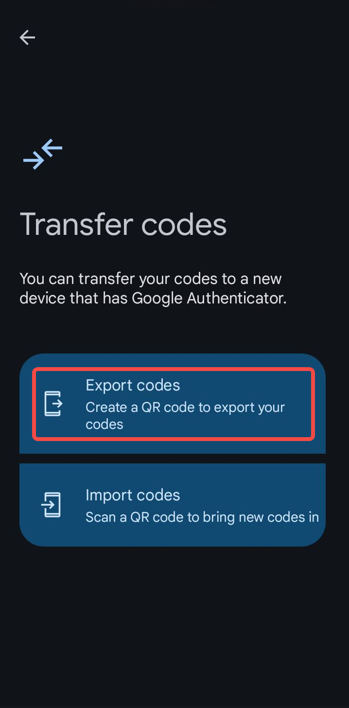 Toca la opción Exportar códigos y, a continuación, selecciona una cuenta para llevar el código a un nuevo dispositivo mediante un escaneo QR.
