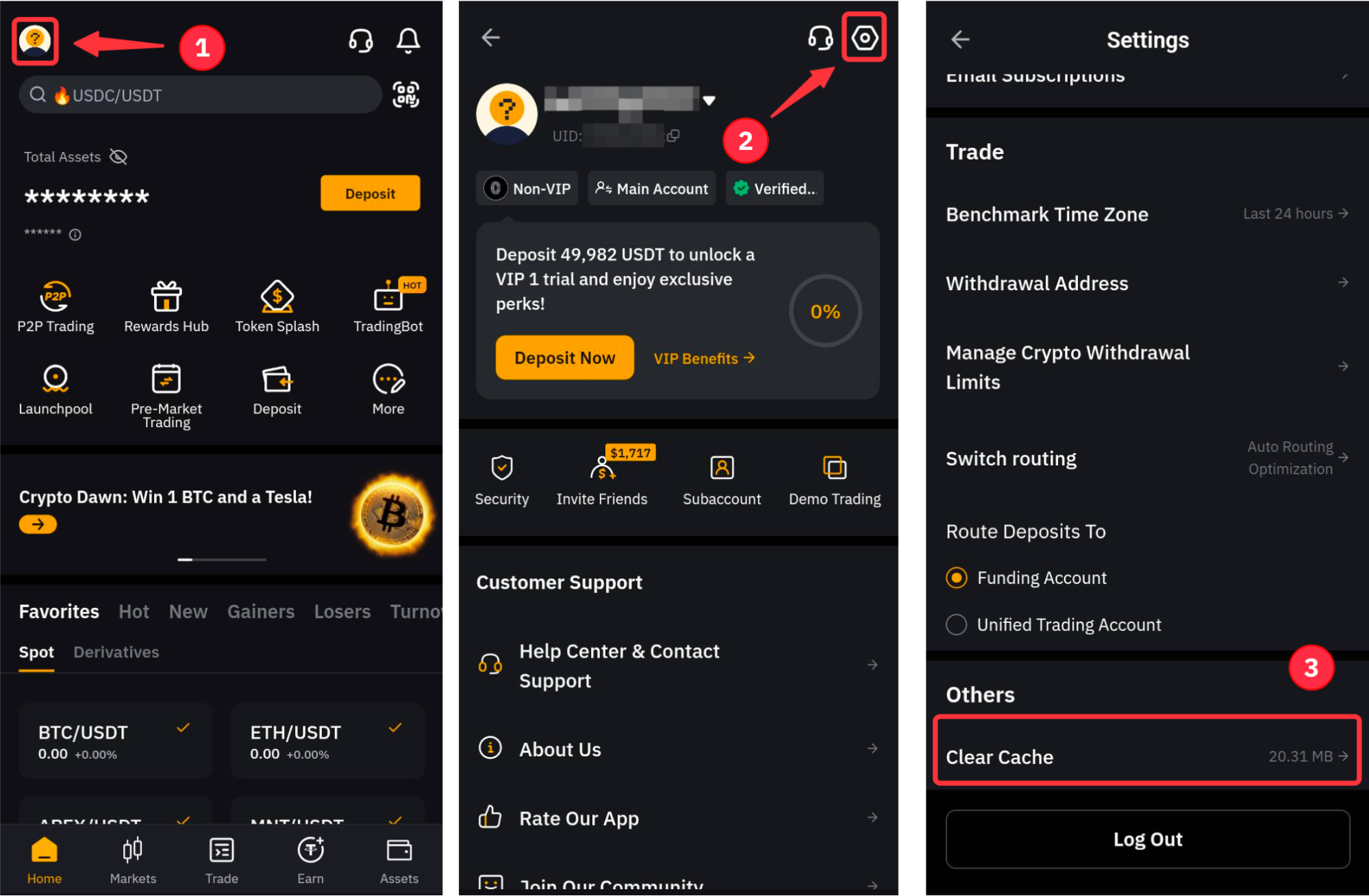 — Ve al icono del perfil en la esquina superior izquierda de la página de inicio. Haz clic en la pestaña Configuración y luego en Borrar caché para borrar la caché de tu teléfono.