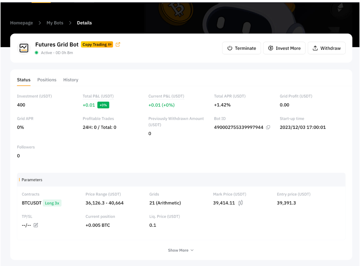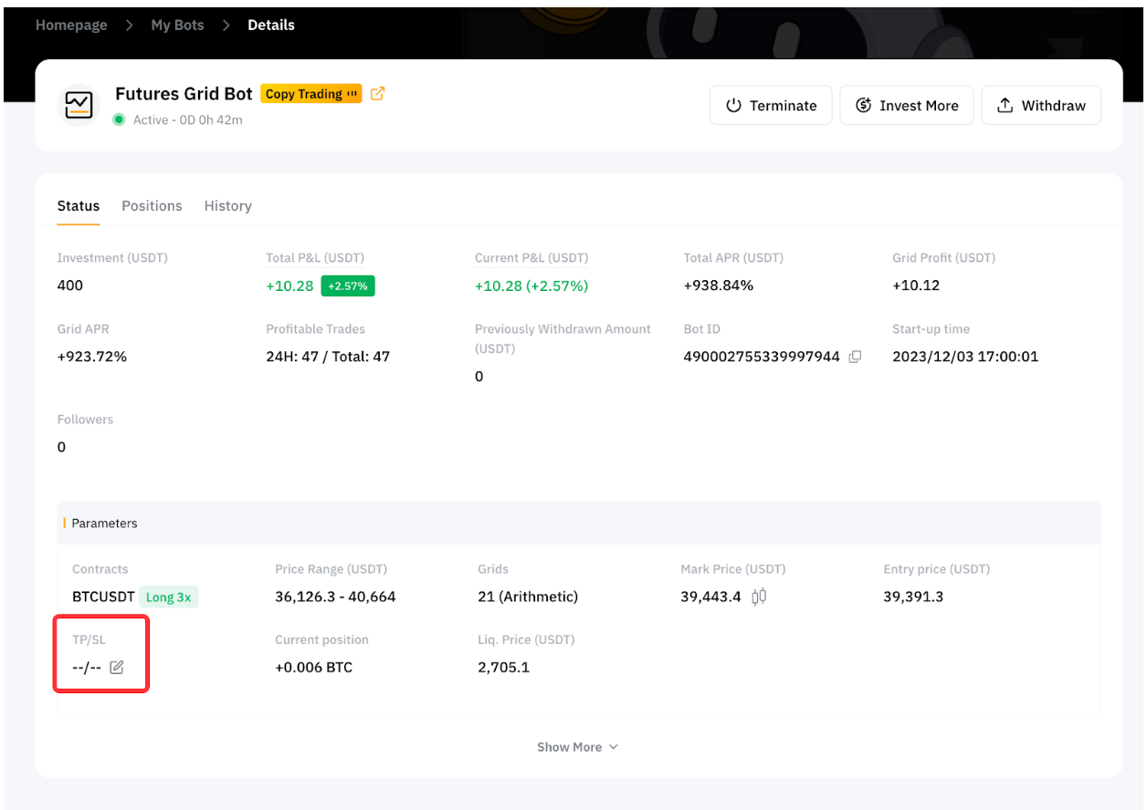 - Si estableces TP/SL en %, cuando tus PyG actuales alcancen el porcentaje establecido, tu bot finalizará y tu posición se cerrará al precio de mercado.