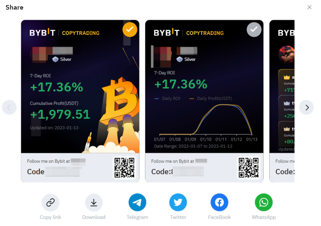 Te permite compartir tu rendimiento de trading en cuentas de redes sociales como Telegram, Twitter, Facebook y WhatsApp con un solo clic.