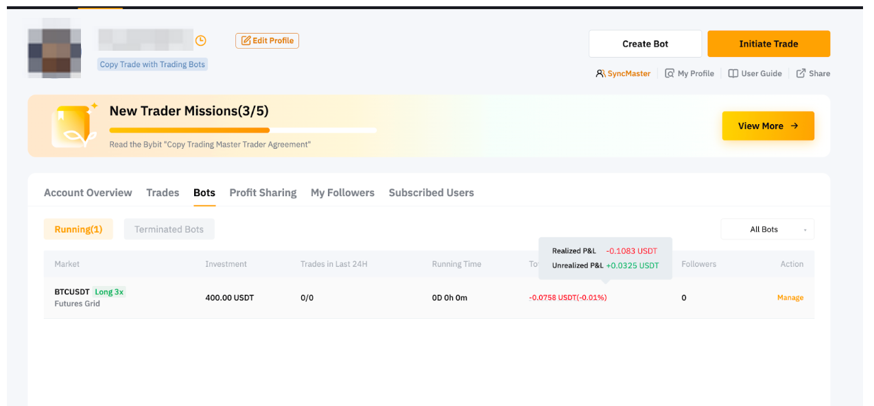 Paso 3: haz clic en Crear bot o Iniciar trade en el lado derecho del Centro del usuario (Master Trader) y se te redirigirá a la página de creación de Trading Bot o a la página de trading de perpetuos de USDT, respectivamente. Actualmente, el copy trading solo admite contratos perpetuos de USDT y grid bots de futuros.