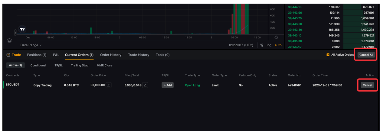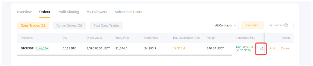 Puedes ver los detalles de la posición o de la orden desde la página de trading de perpetuos de USDT o desde la página Centro del usuario (Master Trader) → Trading. Ambas páginas presentarán los mismos datos.