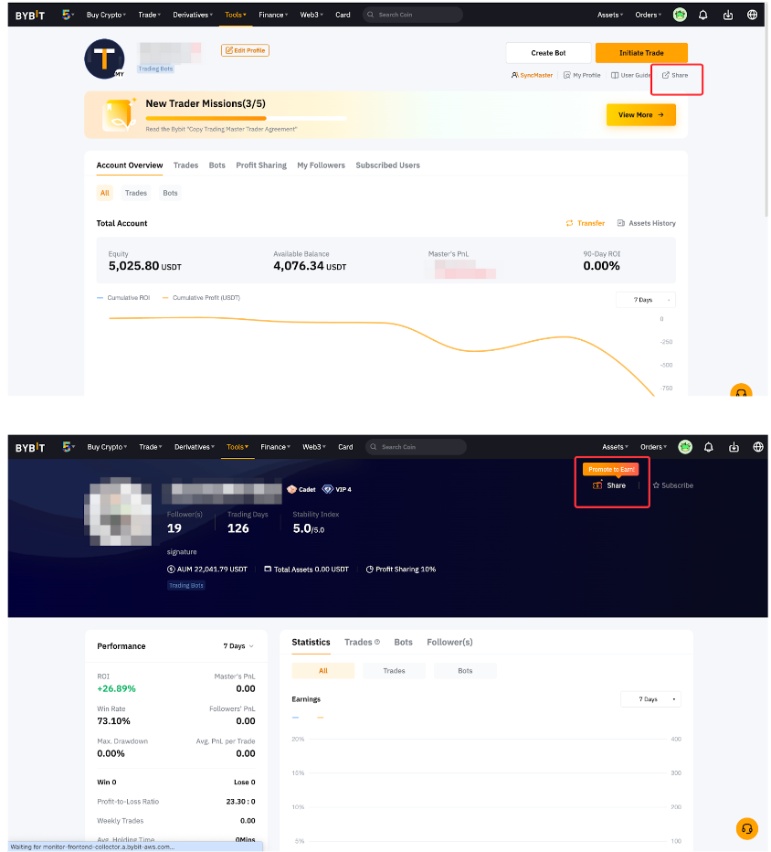 Para compartir tu perfil, haz clic en el botón Compartir situado en la esquina superior derecha de tu página Centro del usuario de copy trading. Como alternativa, puedes hacer clic en Compartir en la página Cartera del master trader.