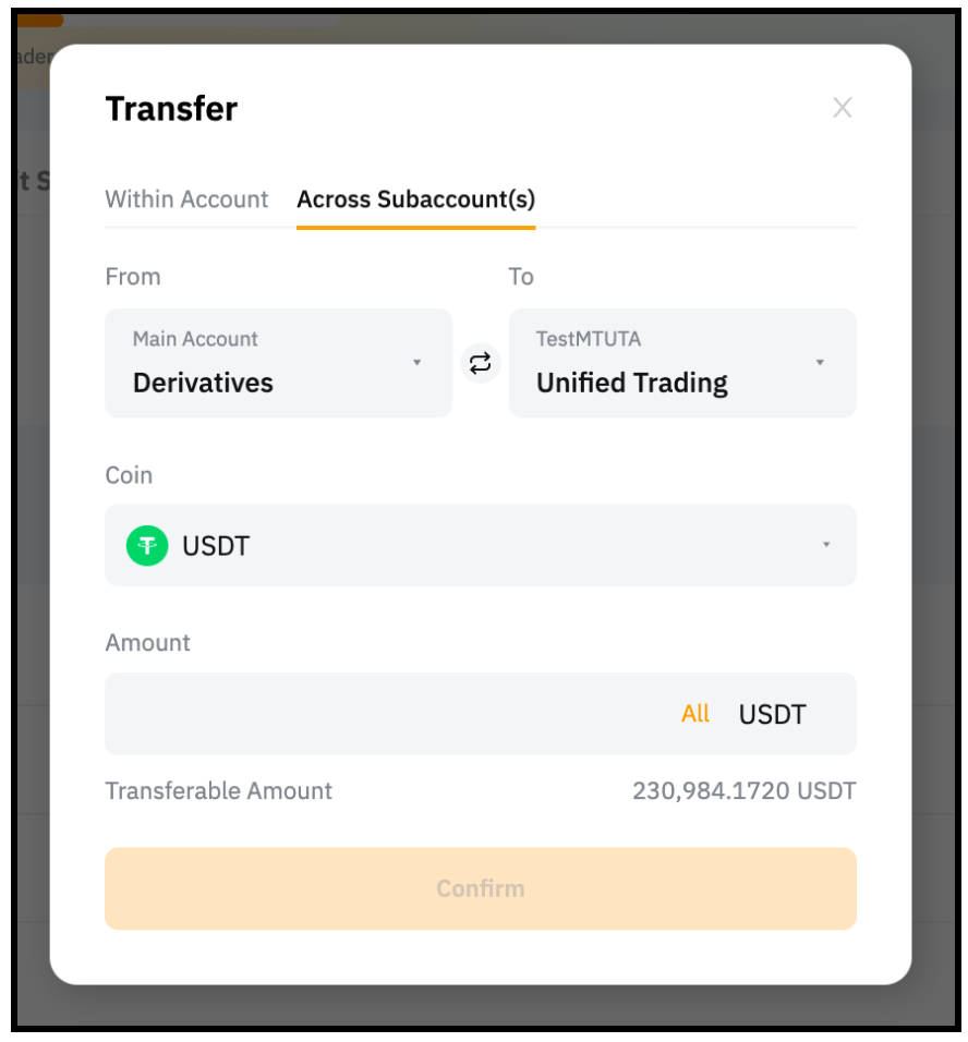 Deberás transferir fondos a tu cuenta de derivados o cuenta de trading unificada (para usuarios de UTA) dentro de tu subcuenta de master trader.