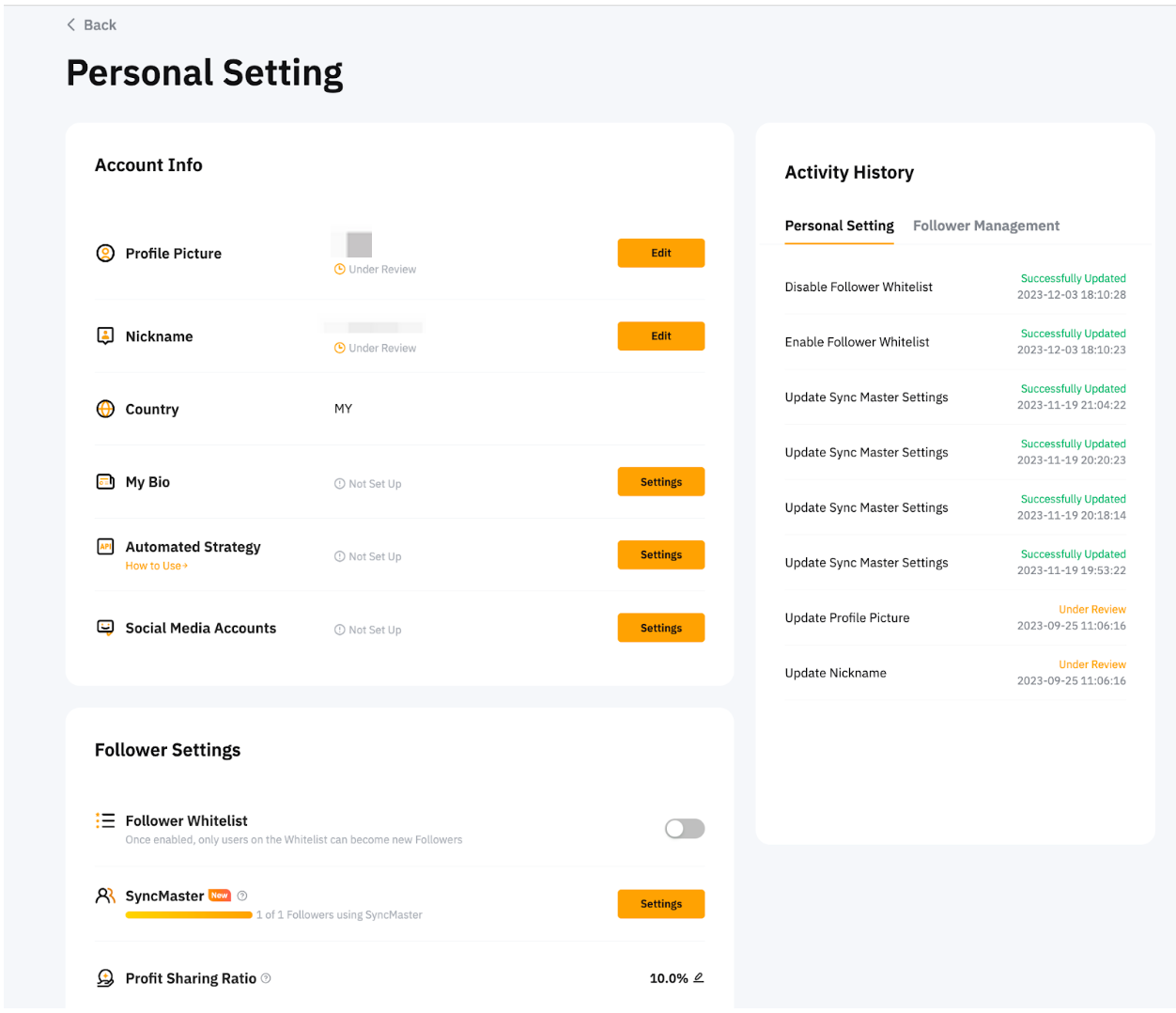 Para ir a tu página de configuración personal, haz clic en Mi copy trading → Editar perfil para administrar tu información de cuenta, ajustes de seguidores y configuración de privacidad. Ten en cuenta que cualquier actualización de la información de cuenta necesitará de 1 a 3 días hábiles para su aprobación.