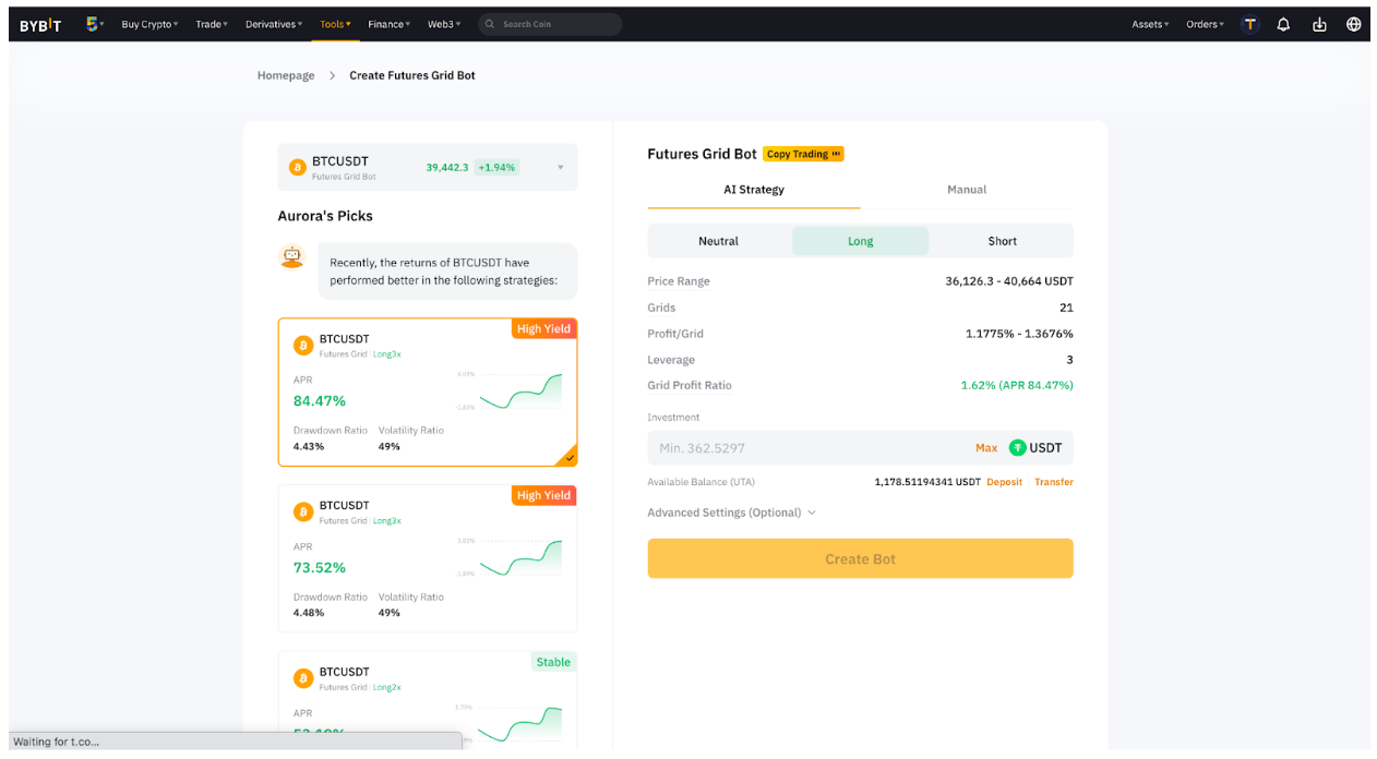 Trading Bot: después de hacer clic en Crear bot, se te redirigirá a la página de creación de grid bot de futuros. Puedes seguir las estrategias de bot sugeridas generadas por Aurora AI de Bybit, o puedes personalizar tus parámetros de bot a la derecha. Para obtener más información sobre el grid bot de futuros, consulta este enlace.