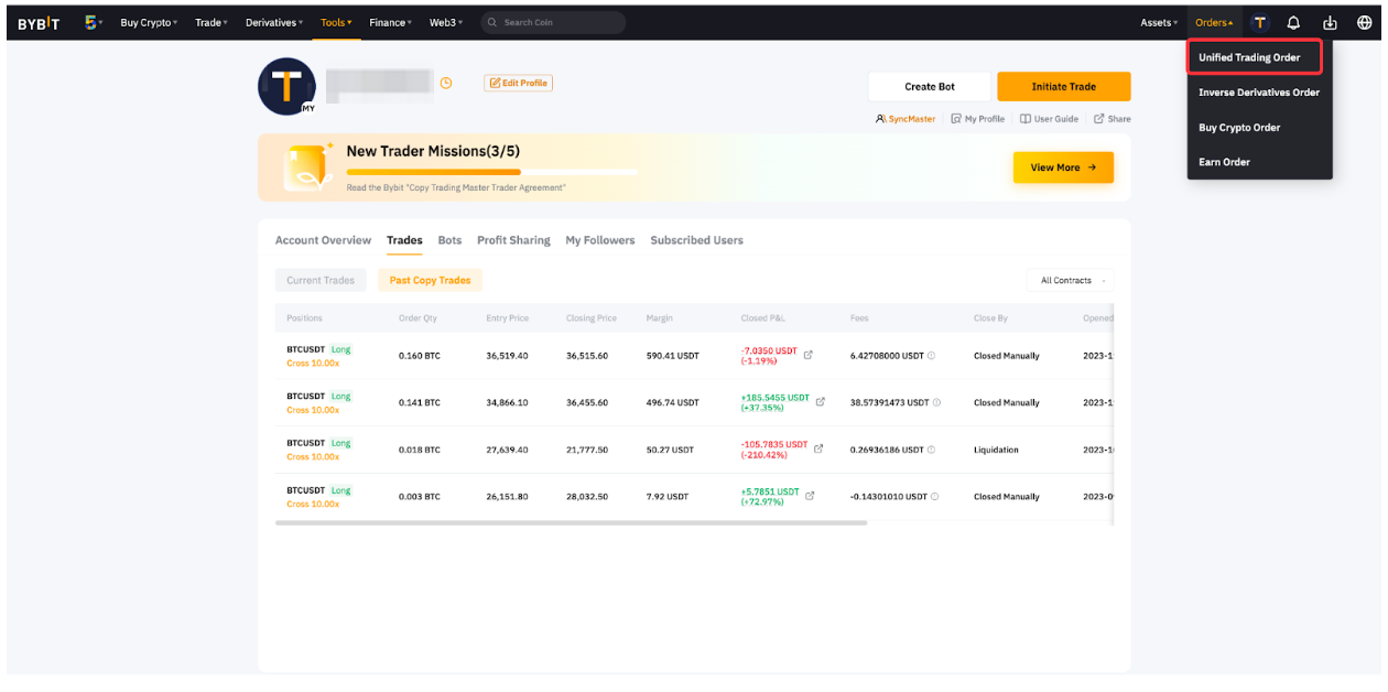 Las pérdidas y ganancias no realizadas en ambas pestañas se calculan en función del precio promedio de entrada. Para ver el historial de cada orden, ve a la página de la orden de trading unificada o de órdenes de derivados. Para obtener más información, consulta Preguntas frecuentes — Copy Trading.