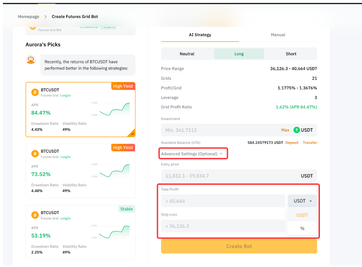 Puedes configurar el Take Profit o Stop Loss por USDT o en porcentaje (%) al crear el bot.